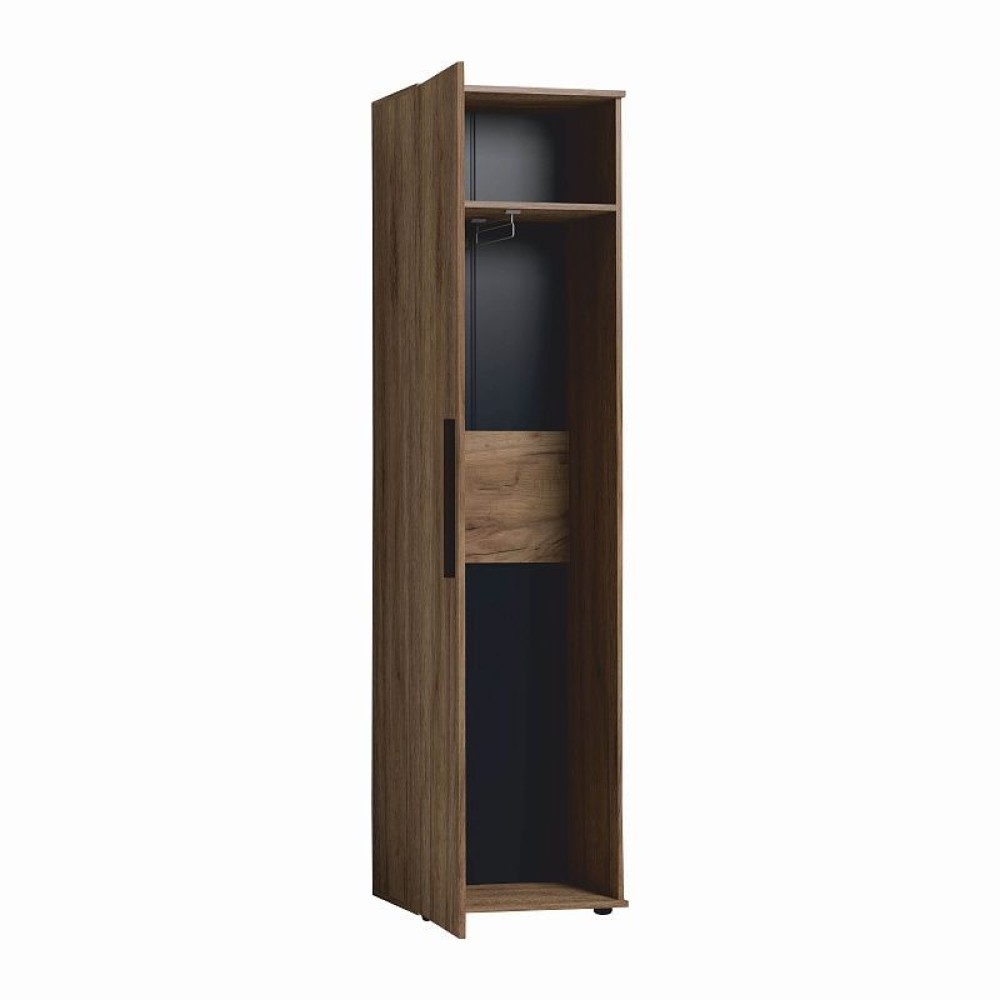 Распашной шкаф в декоре Дуб Табачный комплектуется штангой для одежды и полкой. Выдвижная штанга выдерживает нагрузку до 10 кг. К модулю Nature 71 можно докупить и установитьNature 72 Полки(в комплекте 3 полки) в заранее просверленные варианты присадки. Для удобства использования шкаф может собираться как на левую, так и на правую сторону.