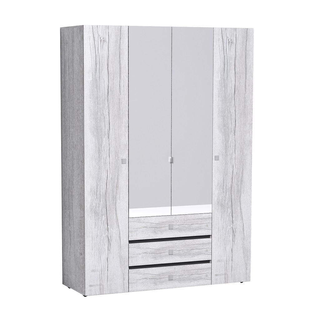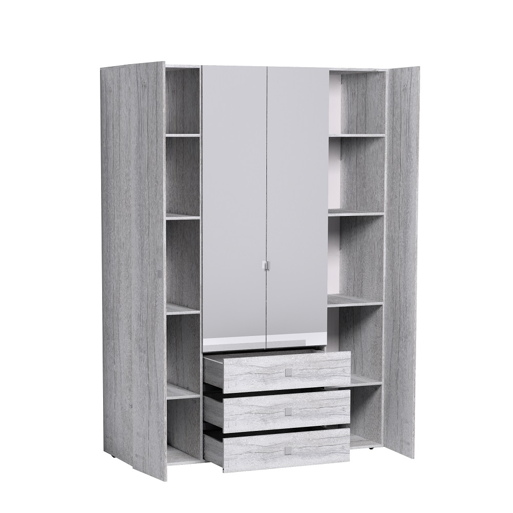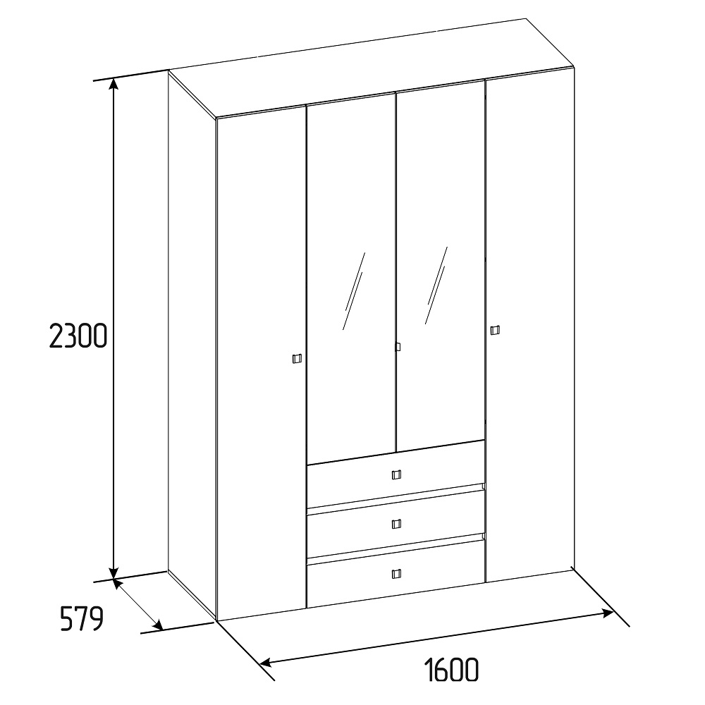 Neo 555 – уникальный по конструктиву шкаф. Зона хранения в нем разделена на 2 симметричные половины: за глухими фасадами расположены регулируемые по высоте полки, а за зеркальными скрывается стационарная штанга, которая выдерживает нагрузку в 40 кг. 3 выдвижных ящика имеют размеры (ШхГхВ) 75х40х14 см каждый и оснащены направляющими плавного выдвижения.