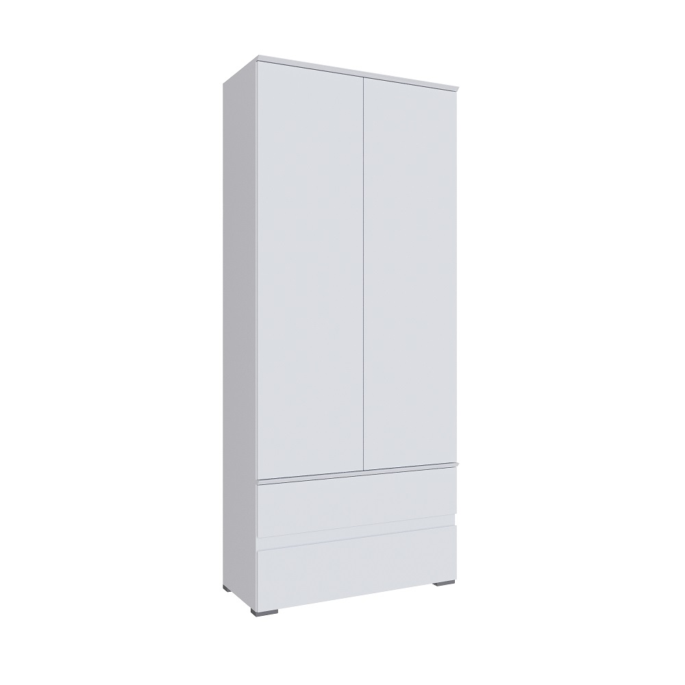 В поисках внместительного белого шкафа со стандартными габаритами рекомендуем присмотреться к модели из серии Плейона. Двухстворчатый шкаф оснащен выдвижной евроштангой, комплектом полок и двумя выдвижными ящиками.