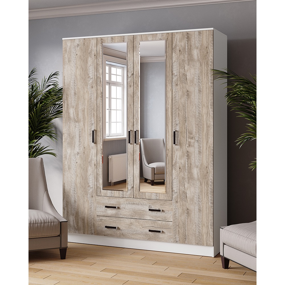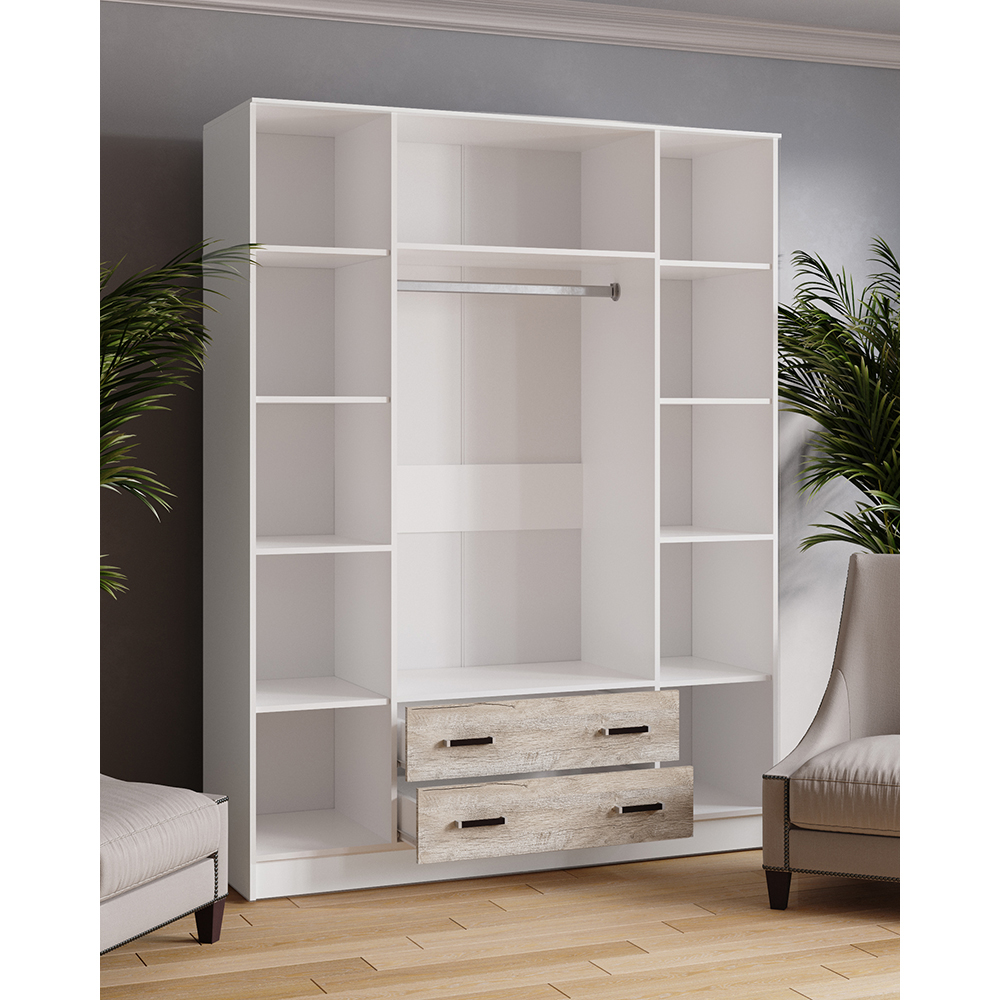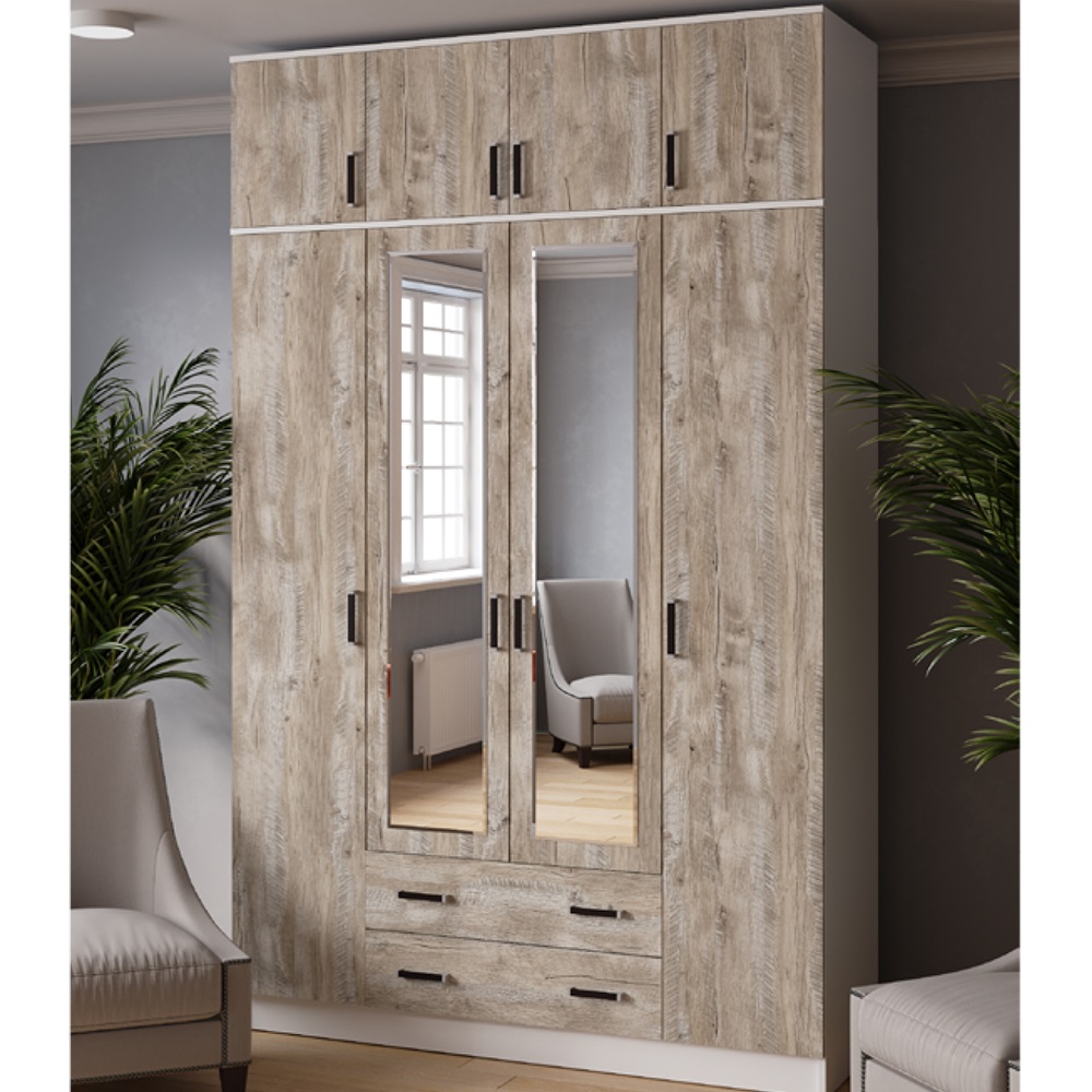 Шкаф комбинированный с антресолью Лагуна шириной 160 см оснащен двумя зеркалами, полками, платяным отделом и выдвижными ящиками. Организуйте место хранения одежды, белья, аксессуаров в одном месте. Благодаря гармоничным пропорциям и универсальному дизайну шкаф будет гармонично смотреться с современной обстановке.