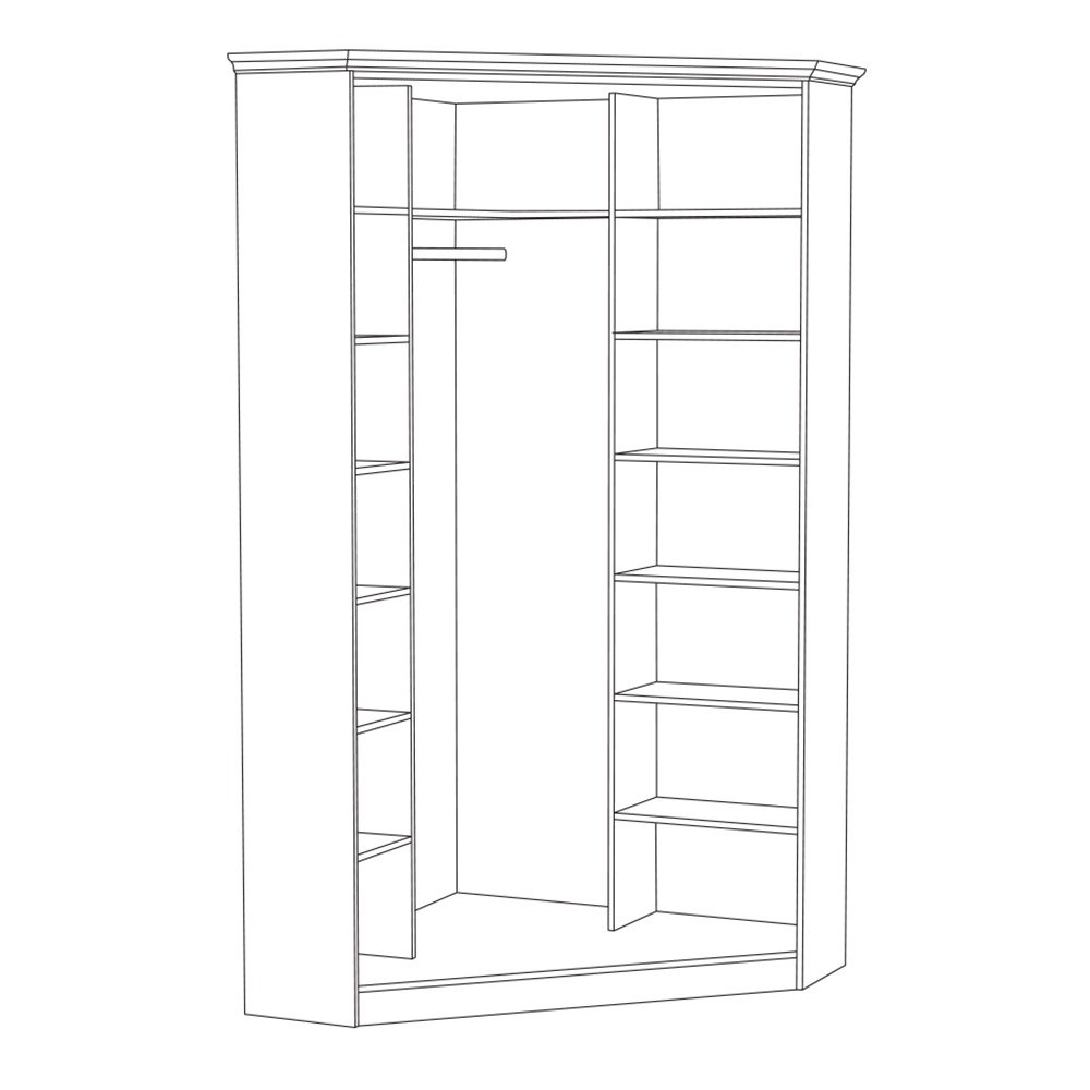 Внутреннее наполнение шкафа продумано до мелочей, создавая идеальные условия для хранения ваших вещей. На полках вы сможете удобно разместить различные предметы: от аккуратно сложенных свитеров и постельного белья до книг и аксессуаров. А стационарная штанга позволит вам с лёгкостью повесить любимую одежду, включая платья, рубашки и жакеты, обеспечивая им идеальный вид и доступность.