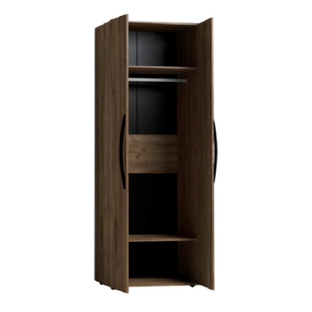 Распашной шкаф для одежды разделяется на отдельно продающиеся элементы: корпус и два фасада - Зеркало и Стандарт. Двухстворчатый шкаф для одежды 54 прекрасно подойдет для хранения одежды и белья в спальне. Гладкие фасады и натуральный декор шкафа привнесут в комнату особый уют и теплоту, а металлические ручки-скобки вместе с 2 мм кромкой ПВХ обеспечат высокую надежность изделия. Распашной шкаф комплектуется стационарной штангой длиной 757 мм, на которой можно разместить до 10 плечиков с верхней одеждой, а также двумя полками - сверху и снизу. Регулируемые опоры компенсируют незначительные неровности пола.