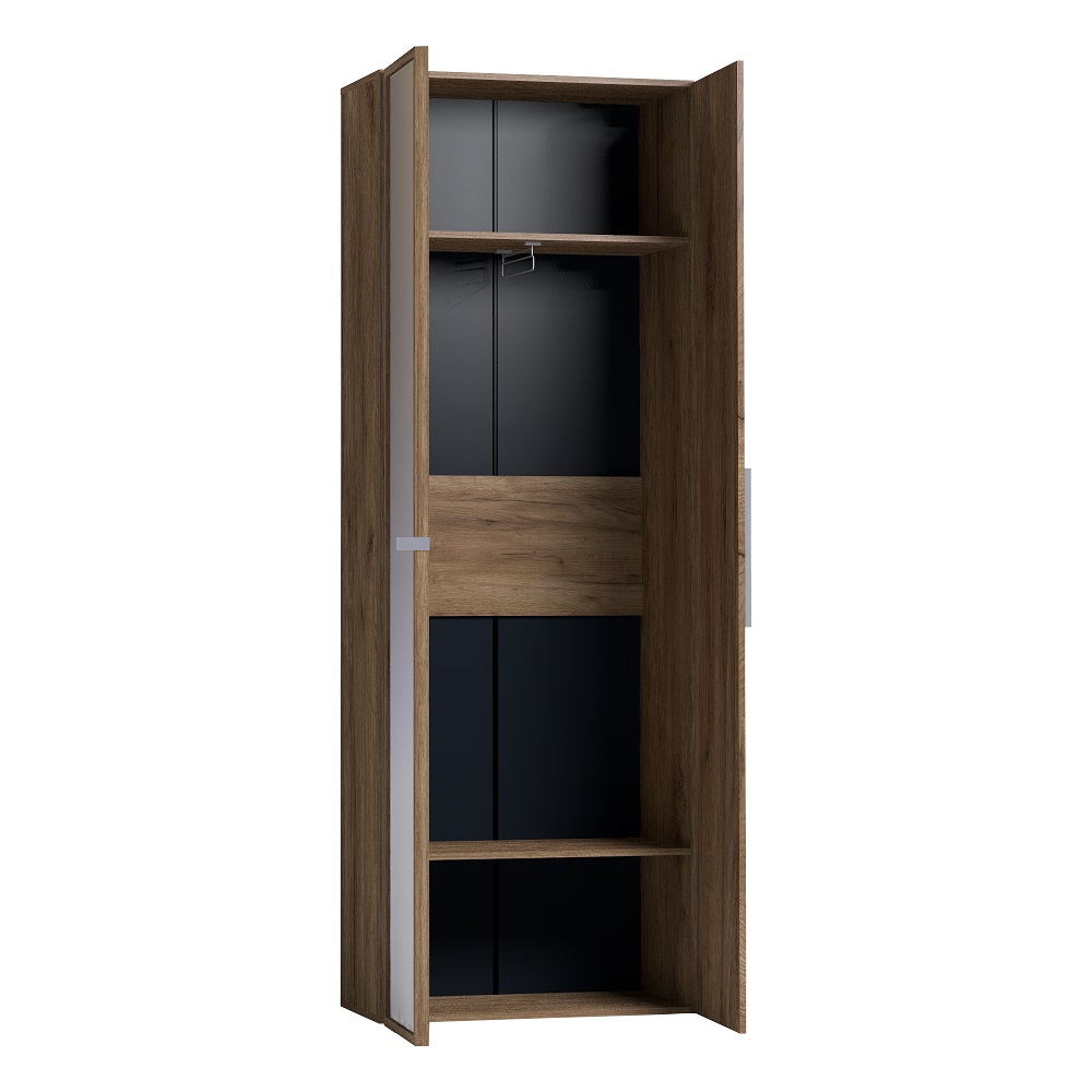 Двухдверный распашной шкаф легко открывается за ручку-петлю из микрофибры, которая устанавливается на одном зеркальном фасаде, другой - открывается за рамку. Шкаф комплектуется выдвижной штангой и двумя нишами сверху и снизу. Корпус шкафа выполнен в декоре Дуб Табачный. Регулируемые опоры компенсируют неровности пола.