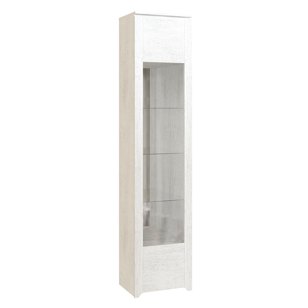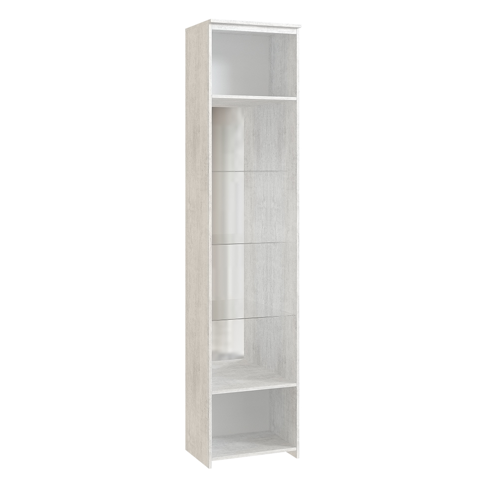 Шкаф для посуды Твист с фасадом со стеклянной вставкой. За дверцей вы найдете две полки из ЛДСП и три стеклянных полки.