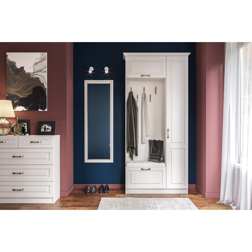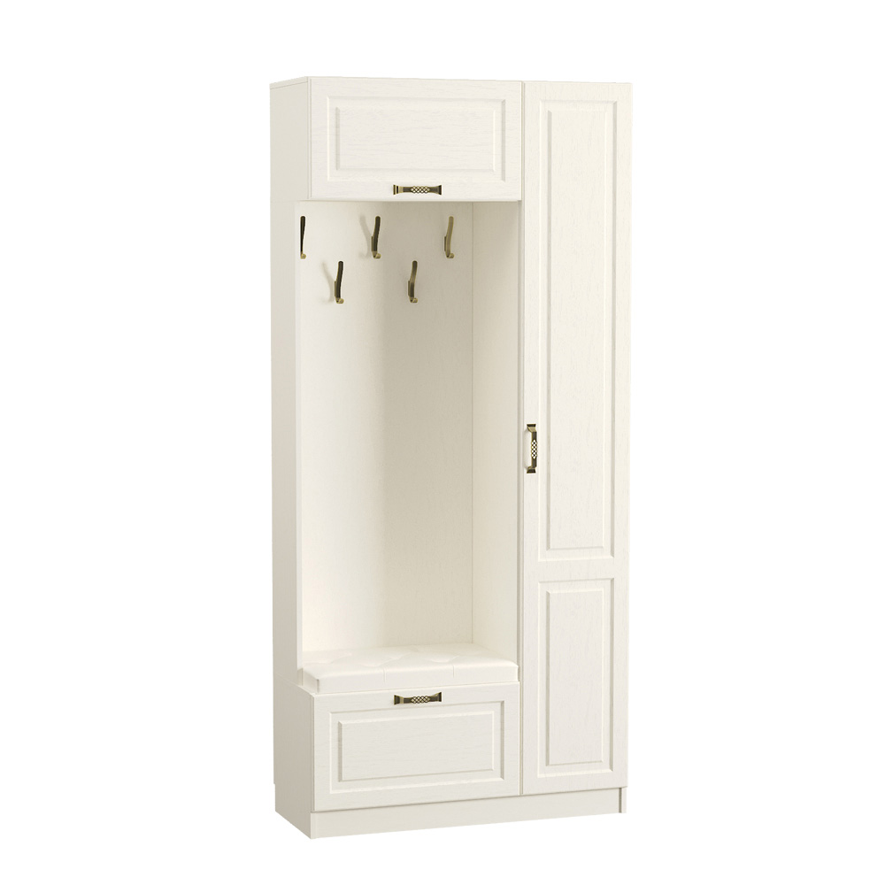 Прихожая Ливерпуль — это компактная классическая прихожая, которая сочетает в себе многофункциональность и удобство использования. Комбинированный шкаф Ливерпуль 13.21 состоит из открытой вешалки с крючками и одностворчатого шкафа с полками. Открытая вешалка оснащена антресольной полкой для головных уборов и распашным отделением для обуви.