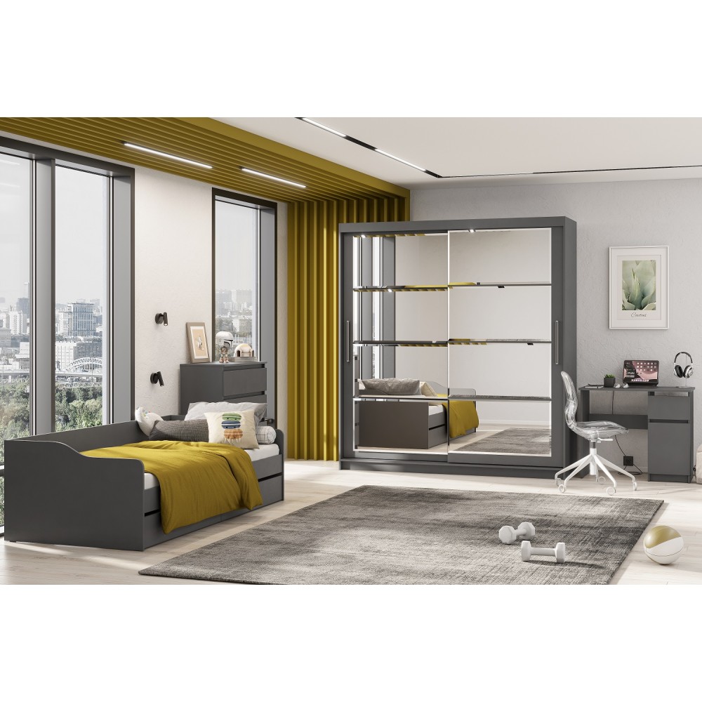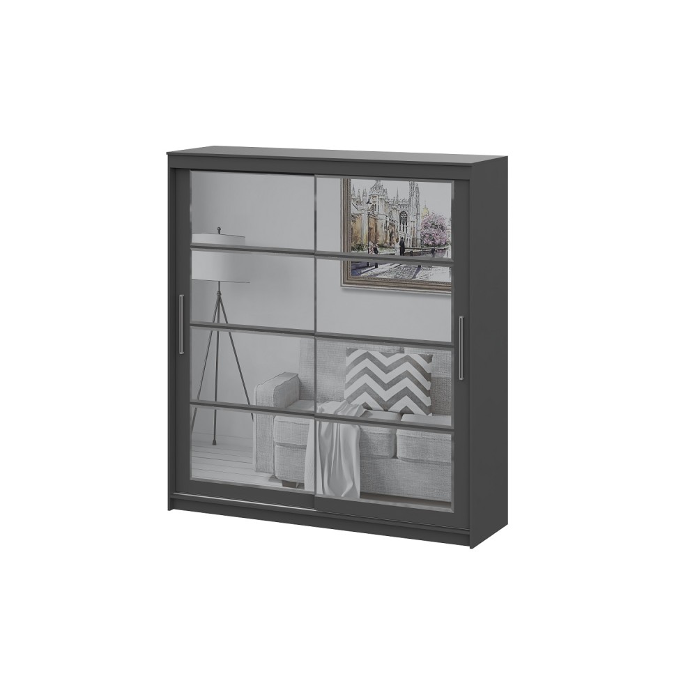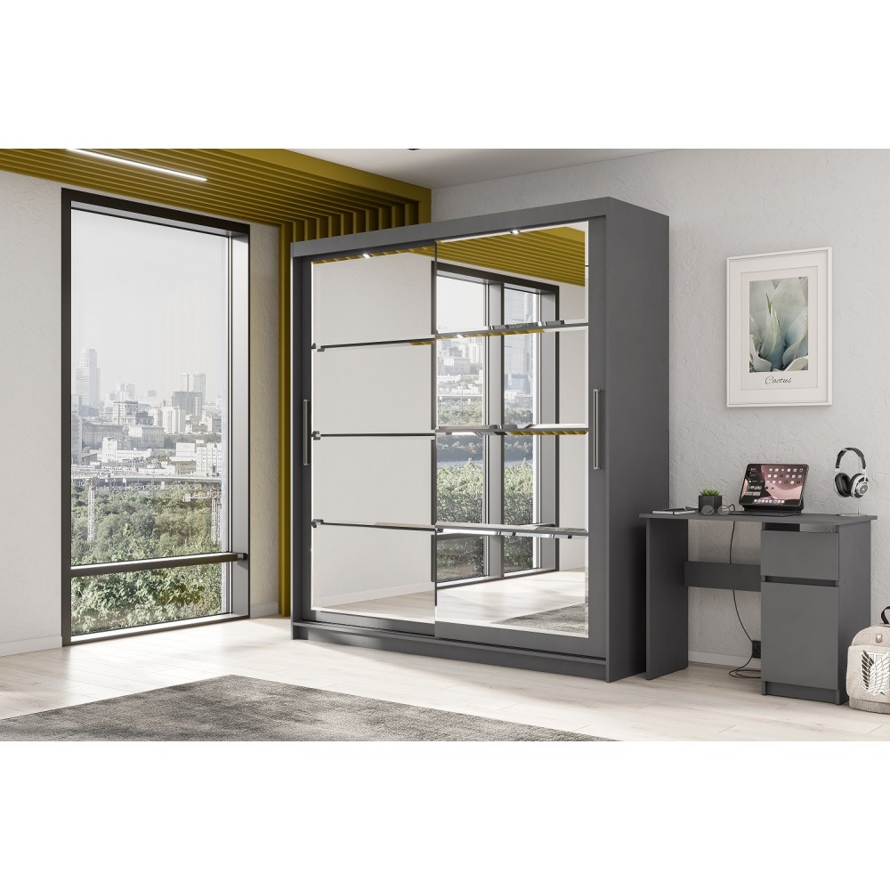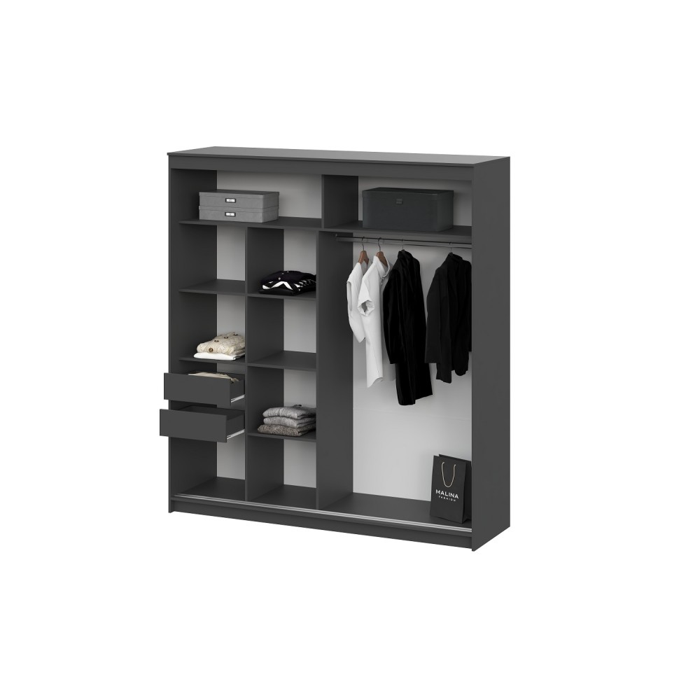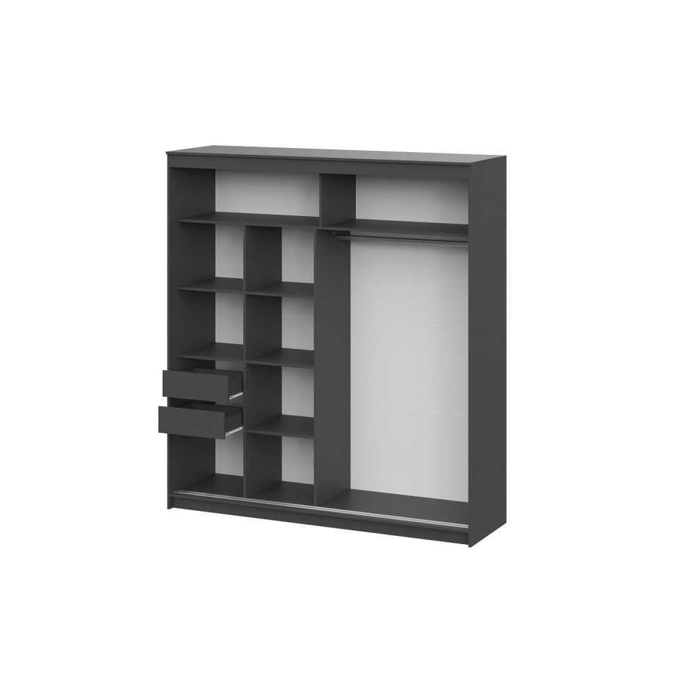 Внутреннее наполнение шкафа включает удобные полки и два выдвижных ящика с одной стороны, а также вместительную платяную секцию с надёжной металлической штангой для одежных вешалок за другой створкой. Нижнеопорная система раздвижных створок обеспечивает лёгкое и ровное открытие.