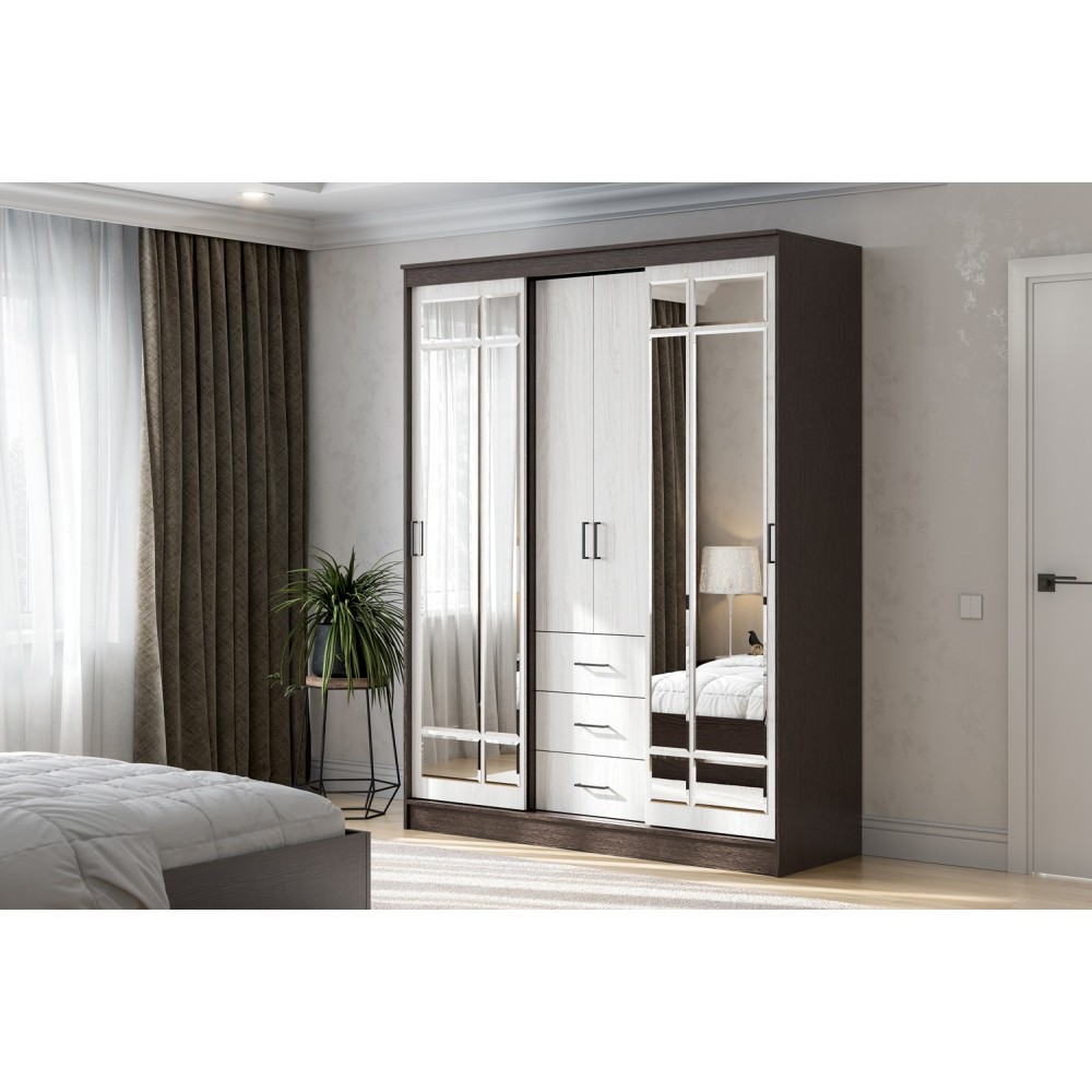 Шкаф-купе ШКП 1 - это идеальное решение для тех, кто ценит функциональность и стиль в интерьере. Внутри расположены платяные отделения с раздвижными створками, укомплектованные штангами и верхними полками, а также бельевое отделение с двумя секциями. В бельевом отделении есть три выдвижных ящика на роликовых направляющих и две распашные створки с декором из зеркал.