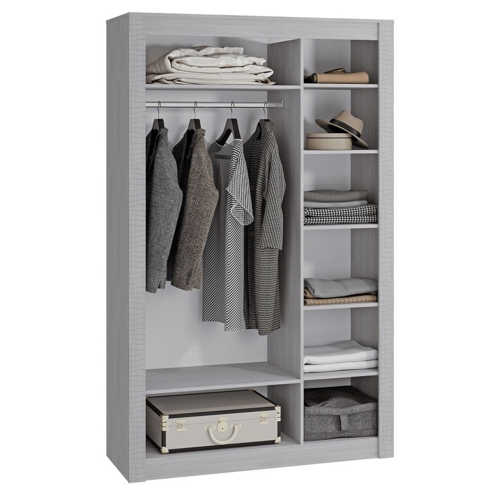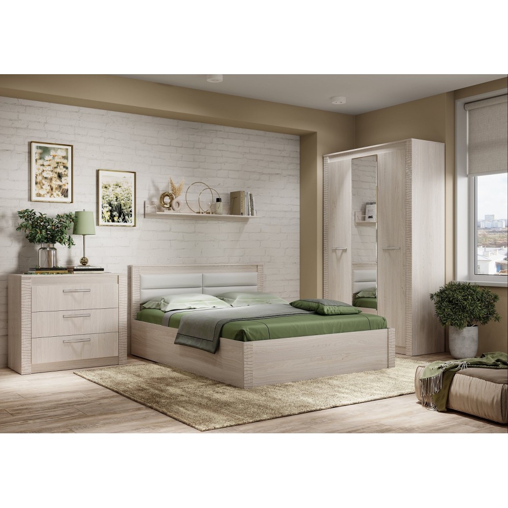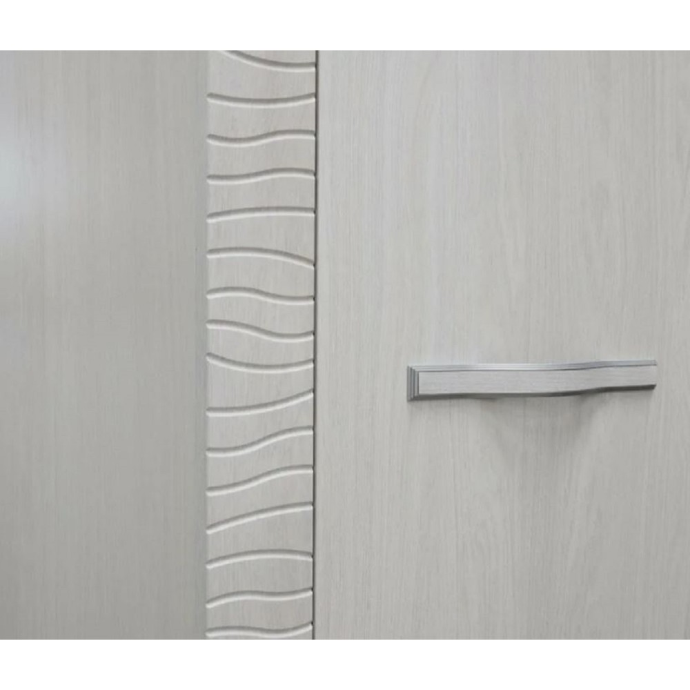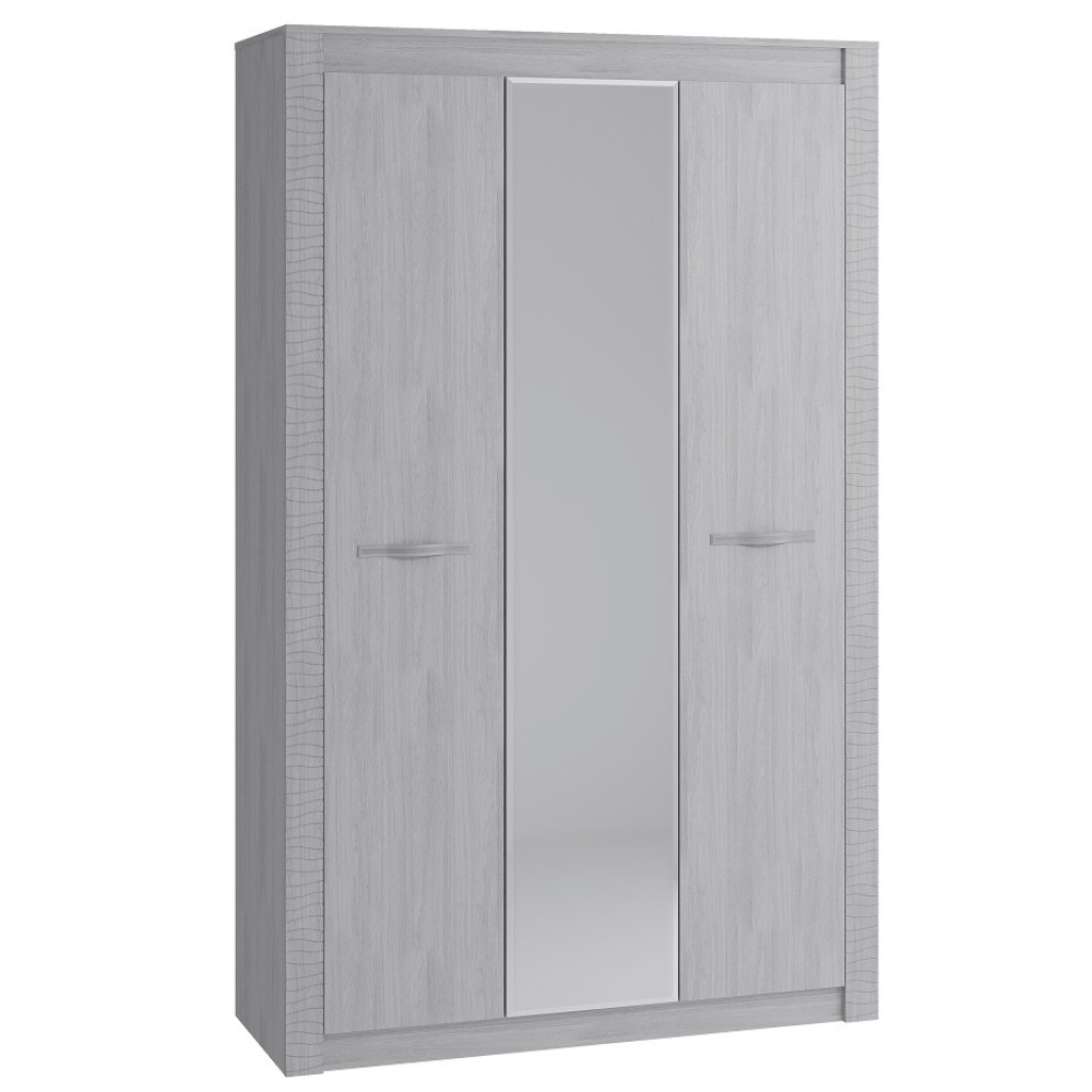 Комплектация шкафа включает несколько полок для хранения вещей в сложенном виде и отделение с хромированной штангой для одежды на вешалках. Для изготовления используется качественная ЛДСП цвета белого ясеня. Центральная створка — полностью зеркальная, две другие дополнены изящными ручками.
