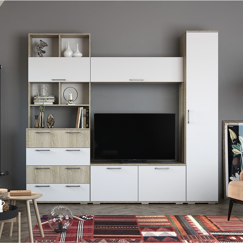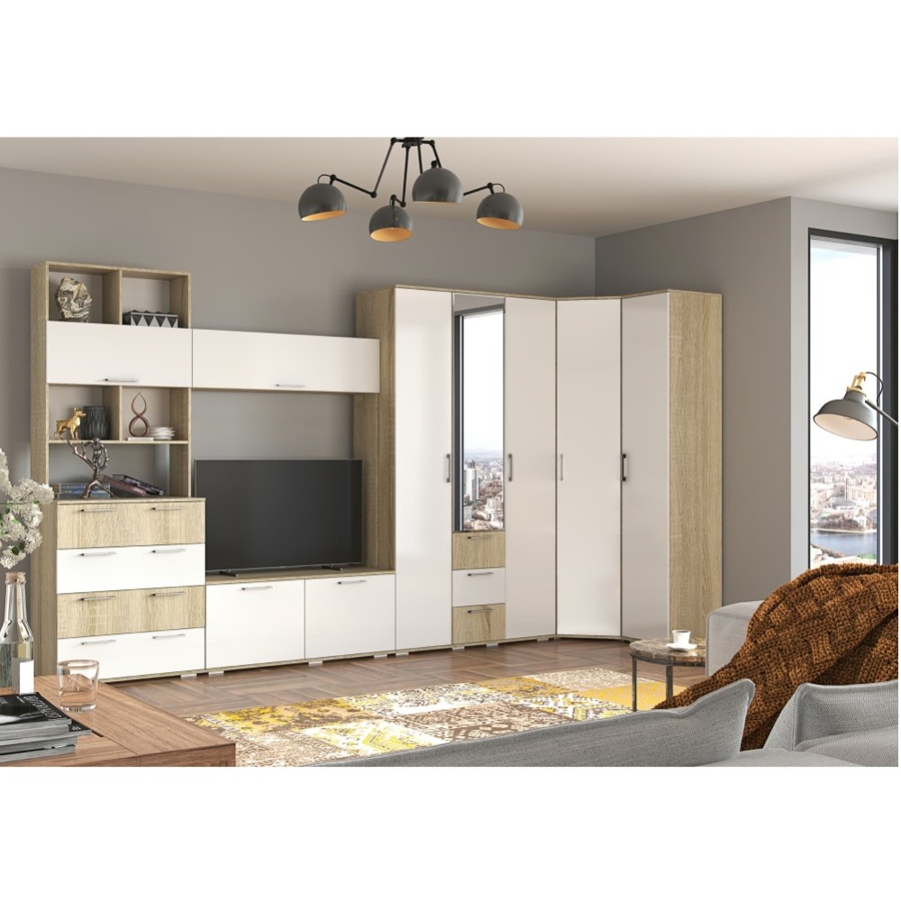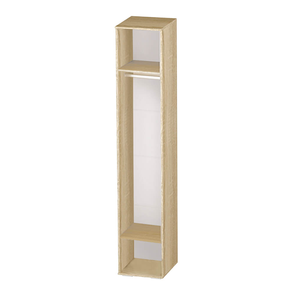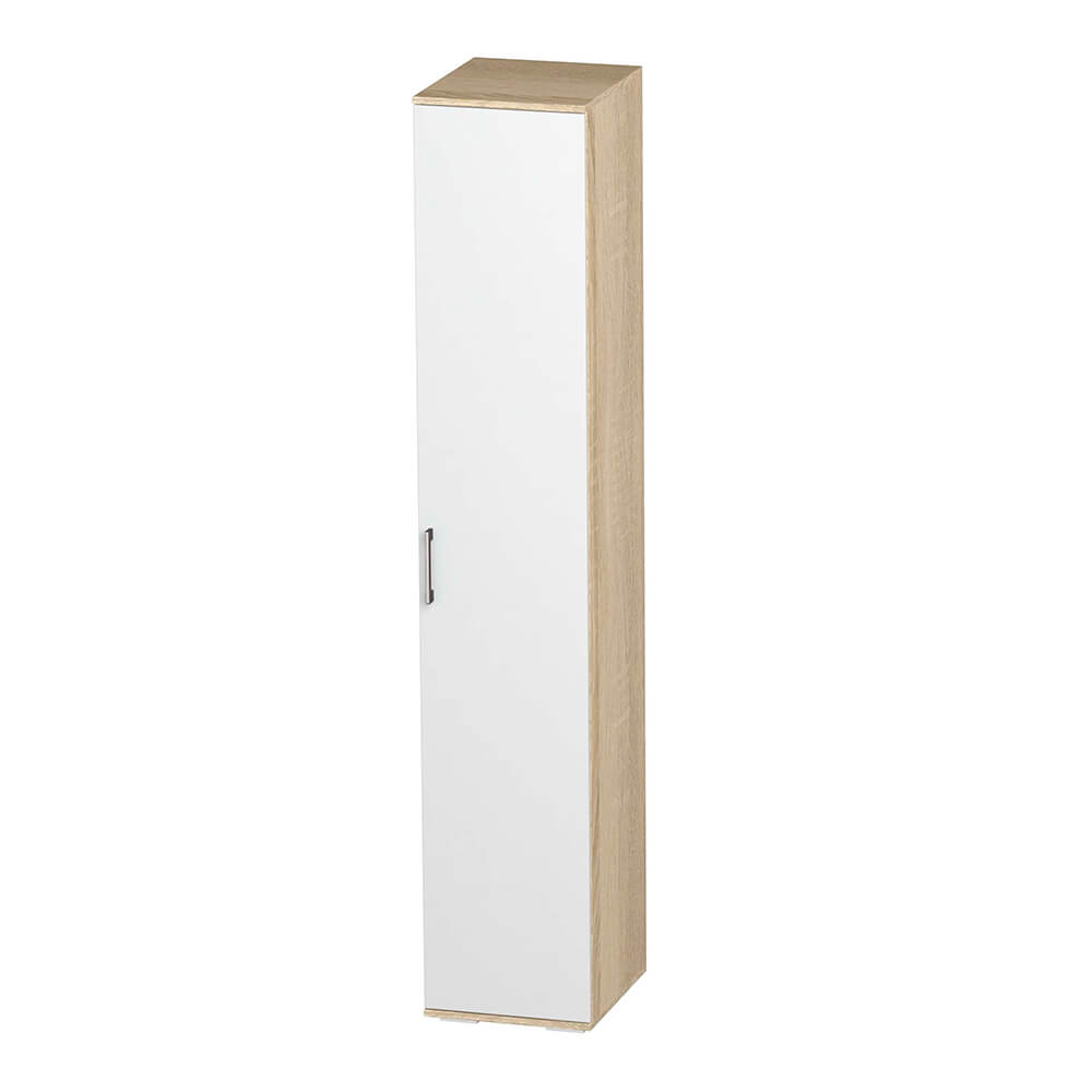Пенал Белладжио — это стильный и качественный предмет интерьера. Он имеет внутреннее наполнение из двух полок и хромированной штанги для одежды на вешалках. Корпус выполнен в цвете «дуб сонома», а дверца — в белом цвете. Пенал не занимает много места и хорошо смотрится в светлом интерьере.