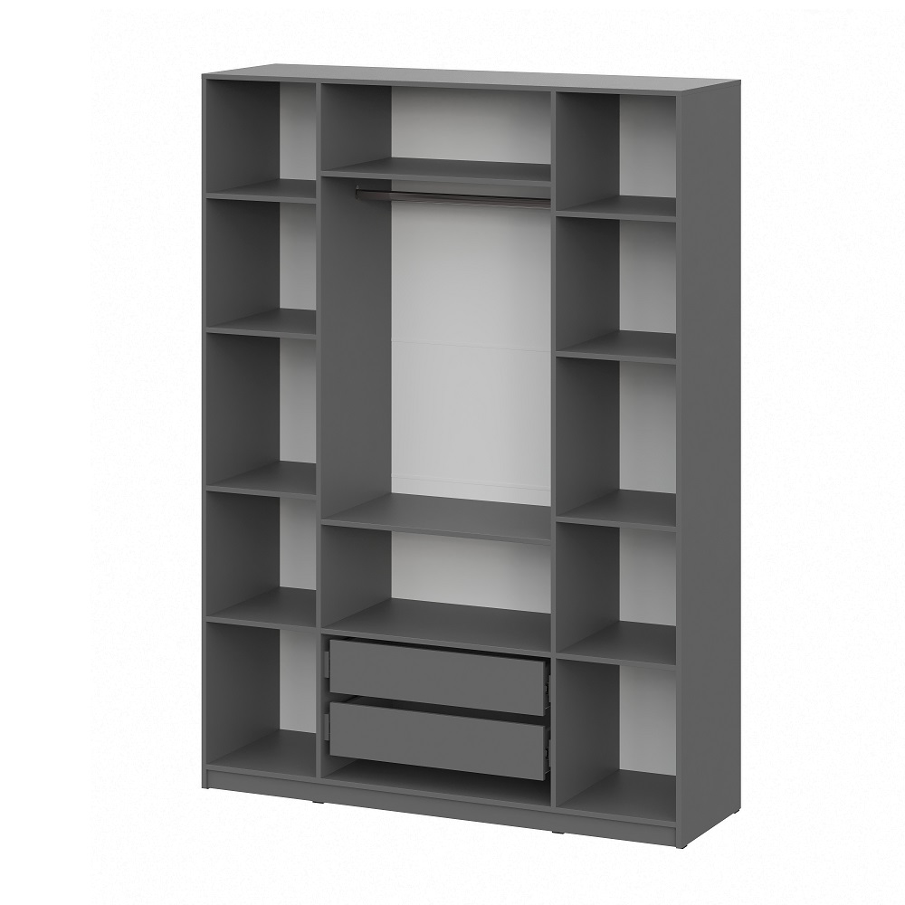 Шкаф оснащен вместительными полками, ящиками и вешалкой-штангой.