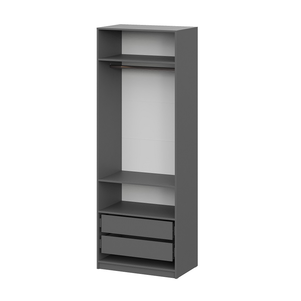 Шкаф оснащен вместительными полками, ящиками и штангой для вешалок.