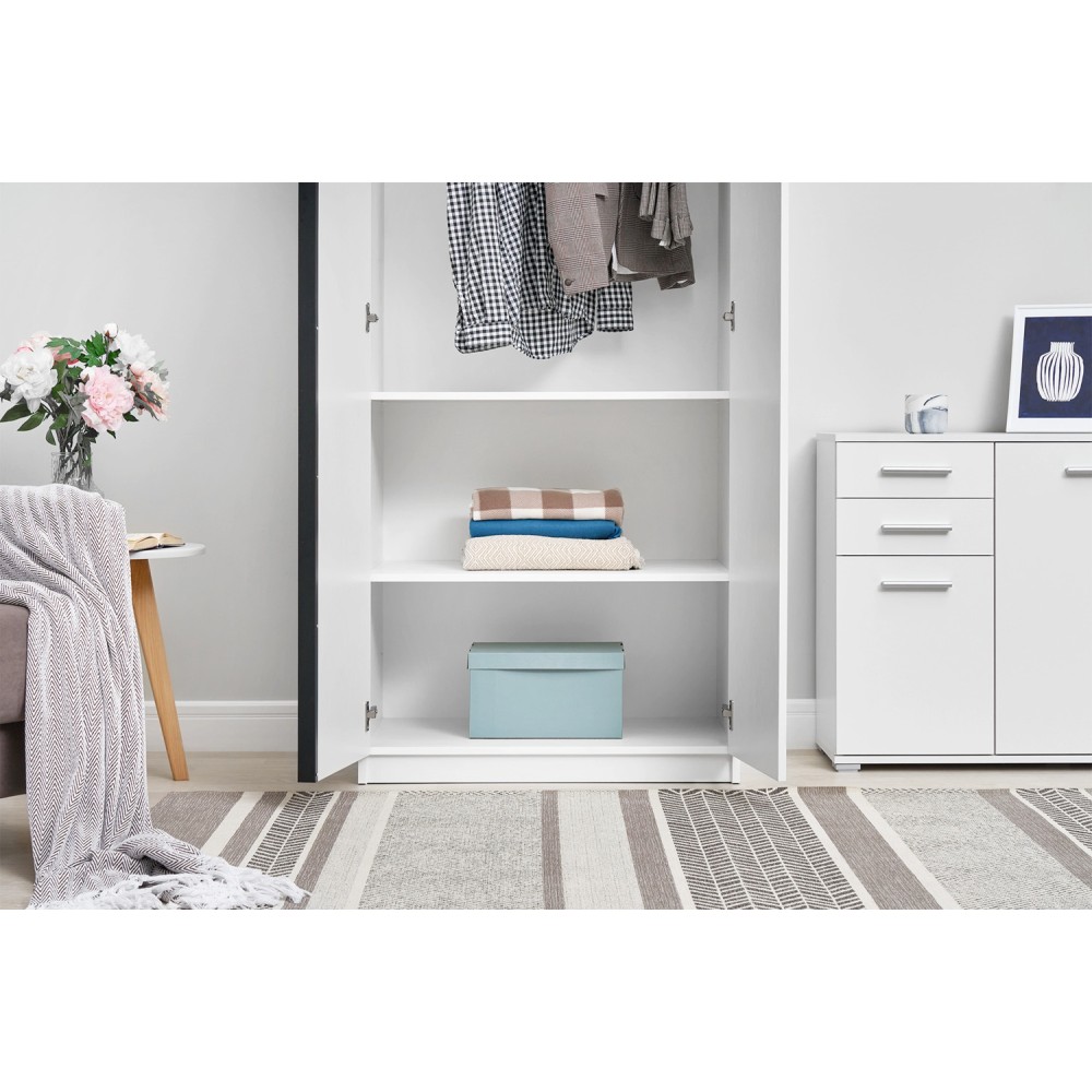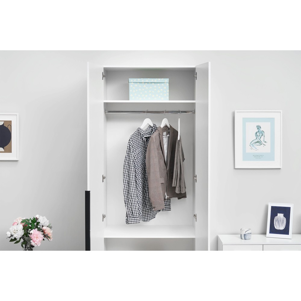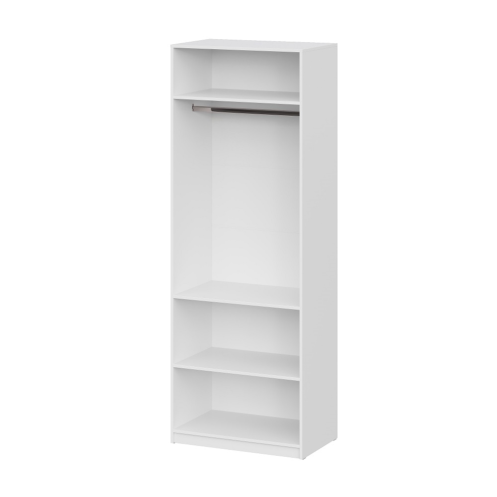 Шкаф оснащен вместительными полками и штангой для вешалок.