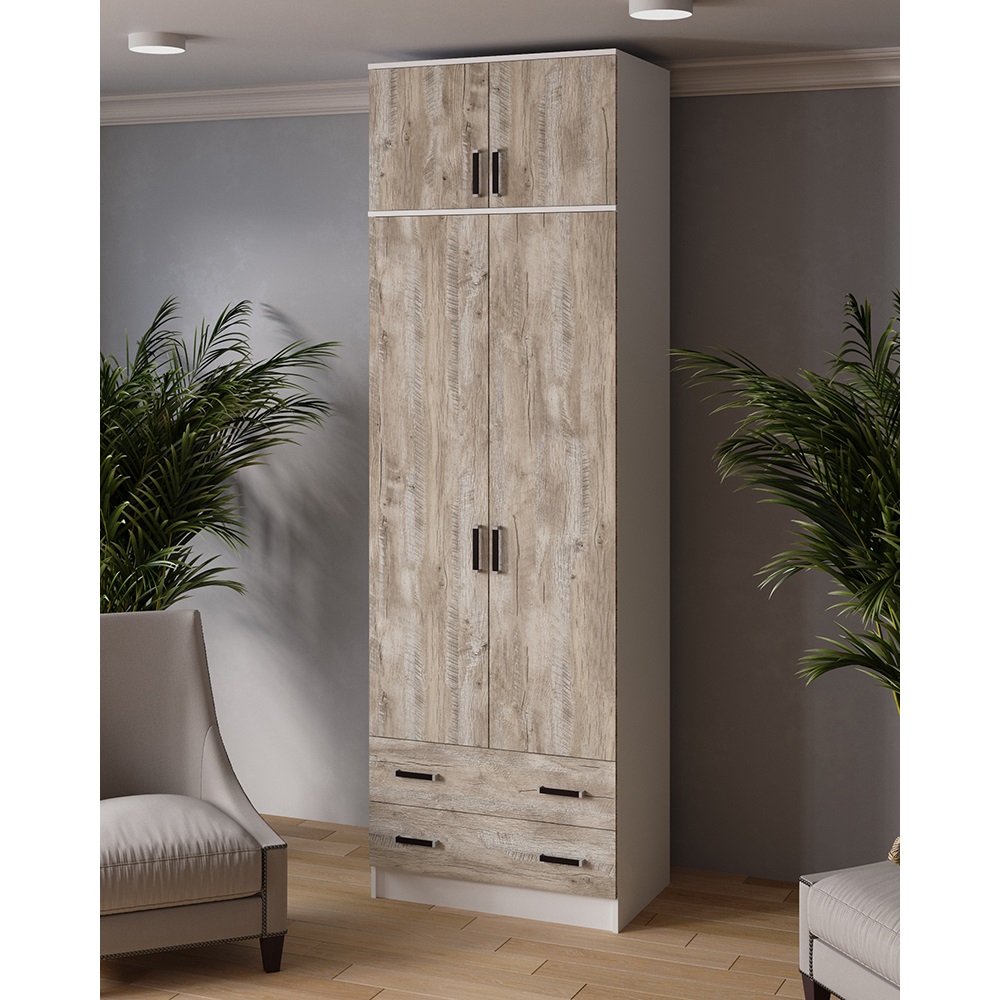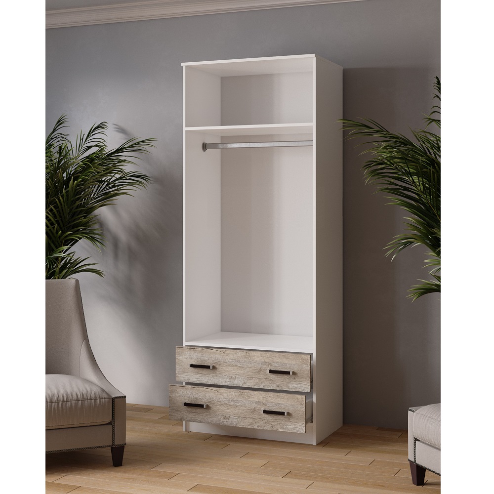Комбинированный шкаф с антресолью Лагуна впишется в любую обстановку, от современного интерьера прихожей до миниматистичной спальни. Шкаф оснащен выдвижными ящиками, штангой для одежды и полкой для вещей в коробках.