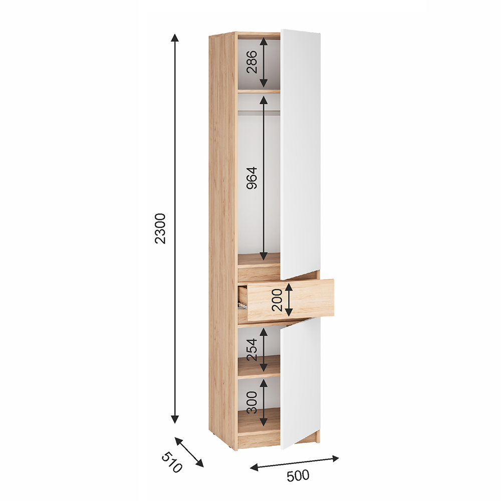 За распашными верхними фасадами вы найдете антресоль и штангу для одежды, а за нижними дверцами широкую полку. Шкаф оснащен выдвижным ящиком.