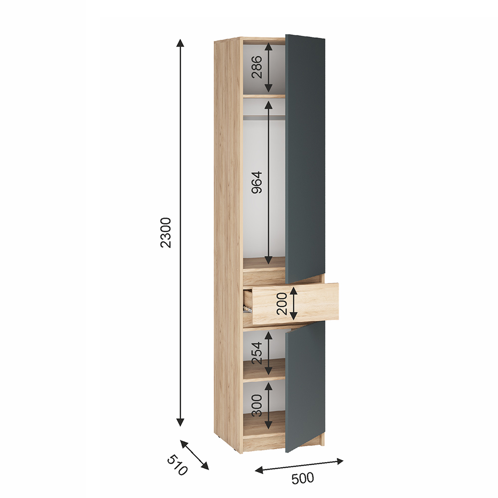 За распашными верхними фасадами вы найдете антресоль и штангу для одежды, а за нижними дверцами широкую полку. Шкаф оснащен выдвижным ящиком.