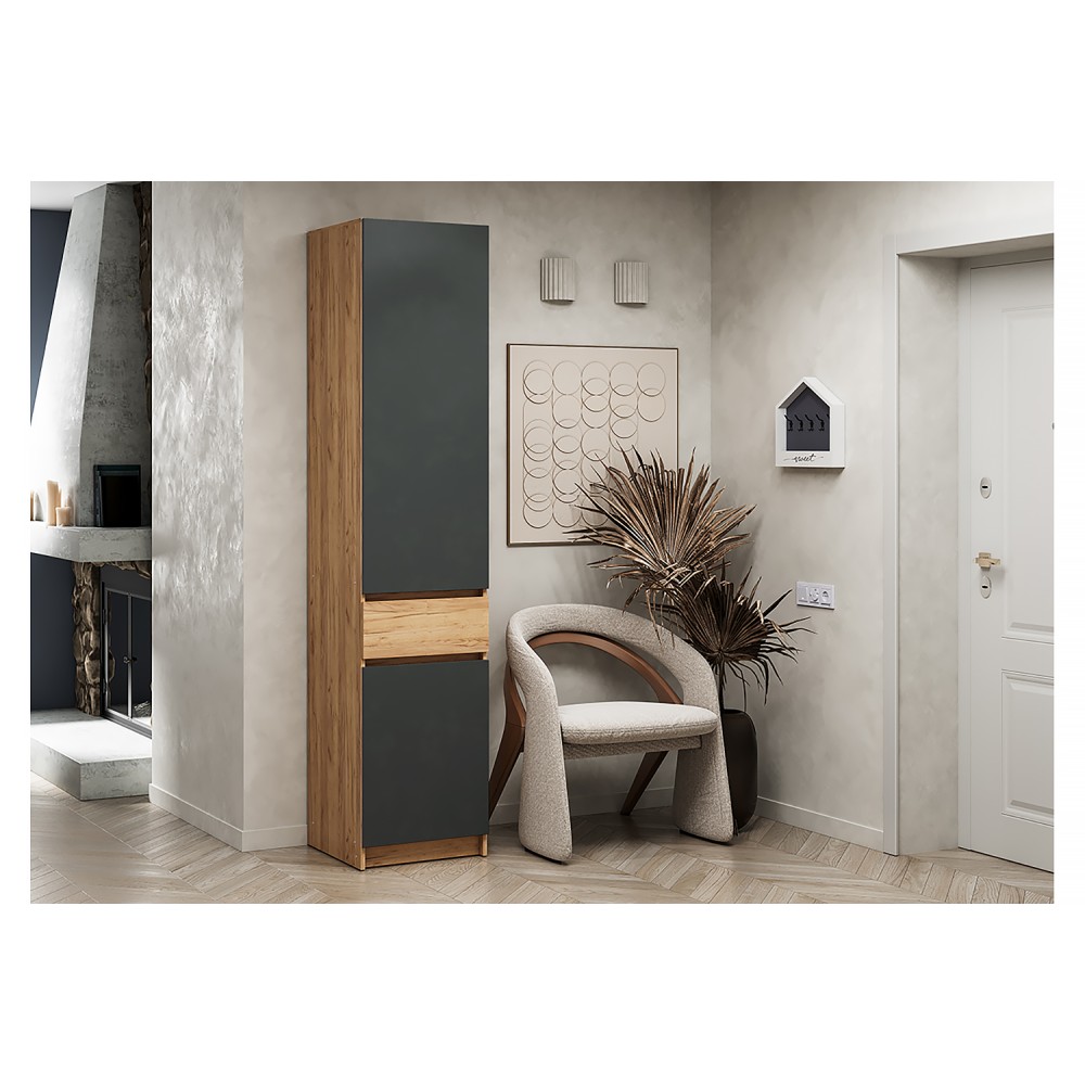 Данная модель из серии Стоуби выполнена в модном цветовом решении корпус: дуб крафт золотой, а фасады вы можете выбрать из двух цветов графит или белый глянец.