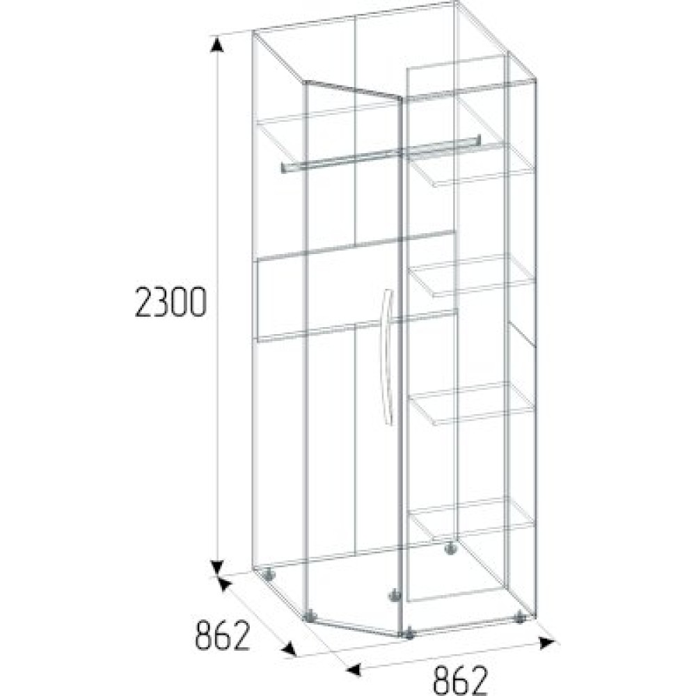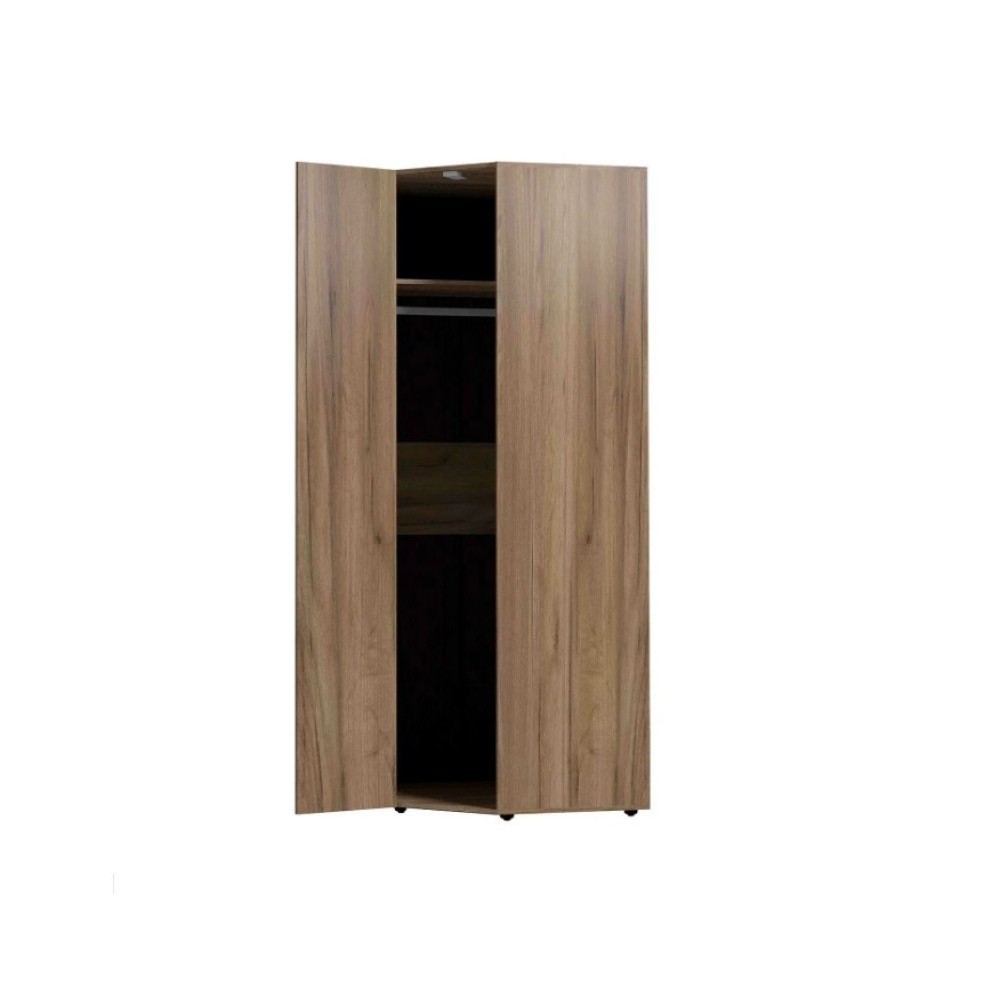 Отлично организовать пространство в маленькой спальне поможет угловой шкаф. Встроенная подсветка, стационарная штанга и полноценный стеллаж для белья внутри способствуют аккуратной организации вещей. Гладкие фасады и натуральный декор шкафа привнесут в комнату особый уют и теплоту. Шкаф обязательно крепится к стене на подвесы, а компенсировать неровности пола можно, благодаря регулируемым опорам.