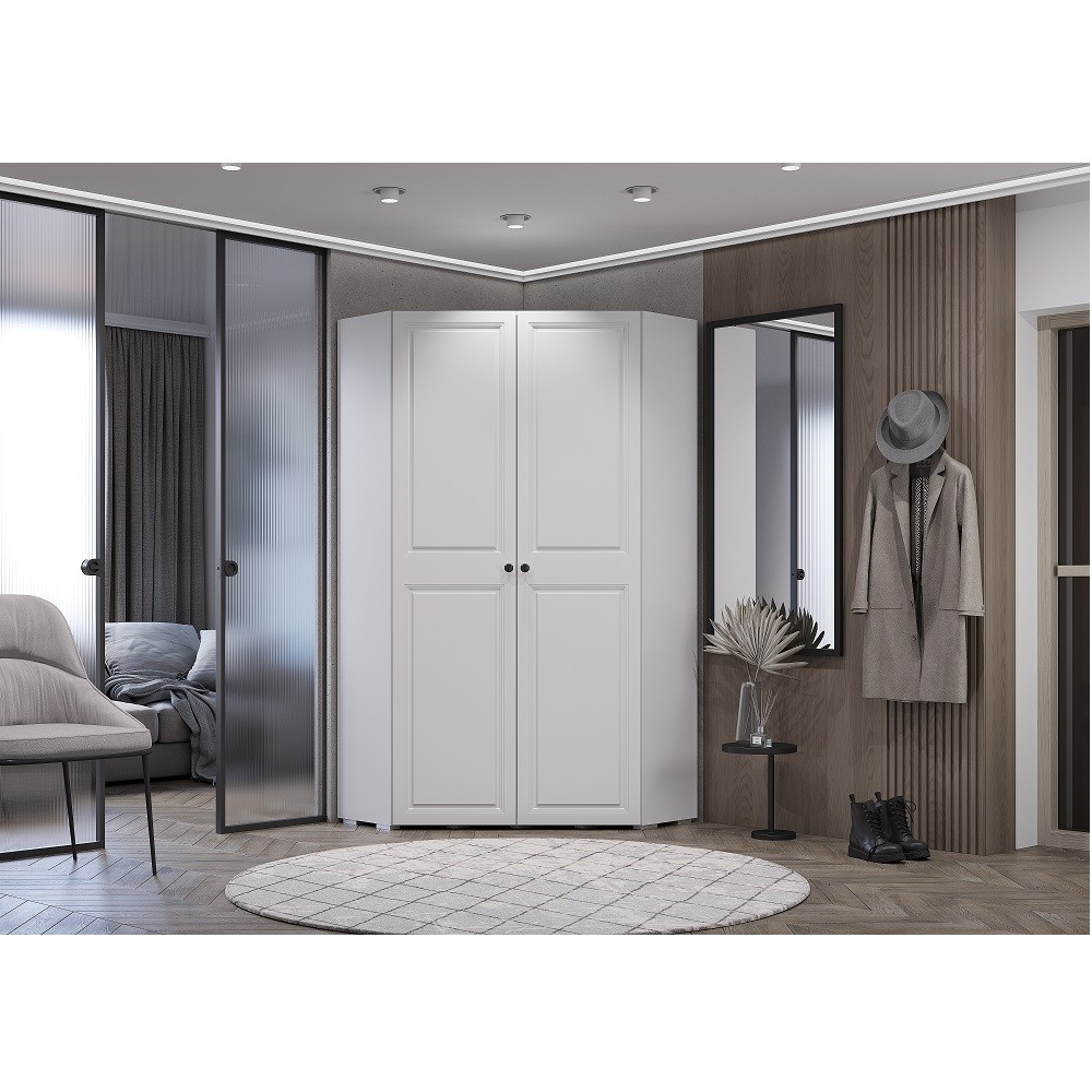 Вместительный шкаф угловой конфигурации с широкой стационарной штангой и комплектом полок. Идеально сочетается с остальными шкафами коллекции Софт в составе шкафной группы.