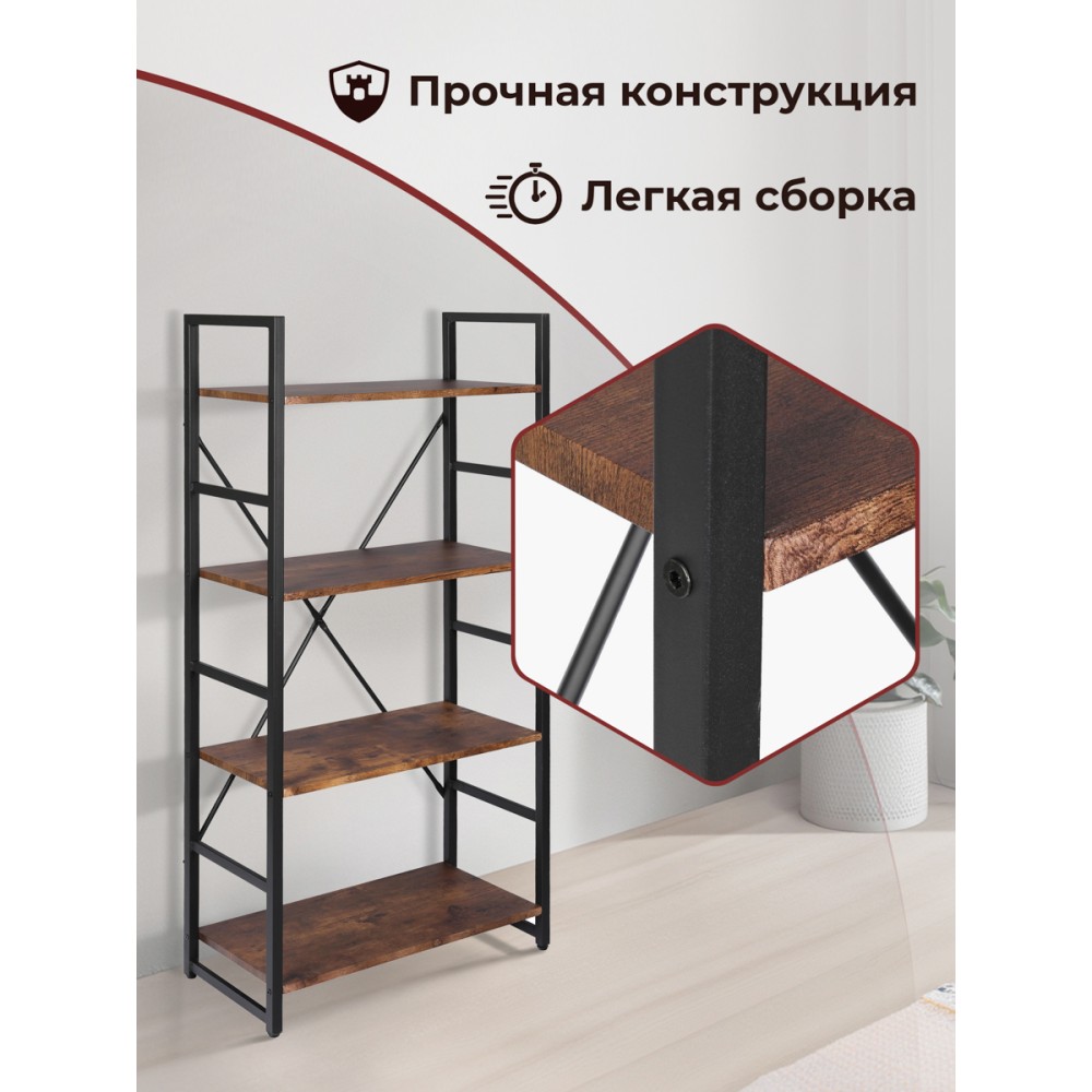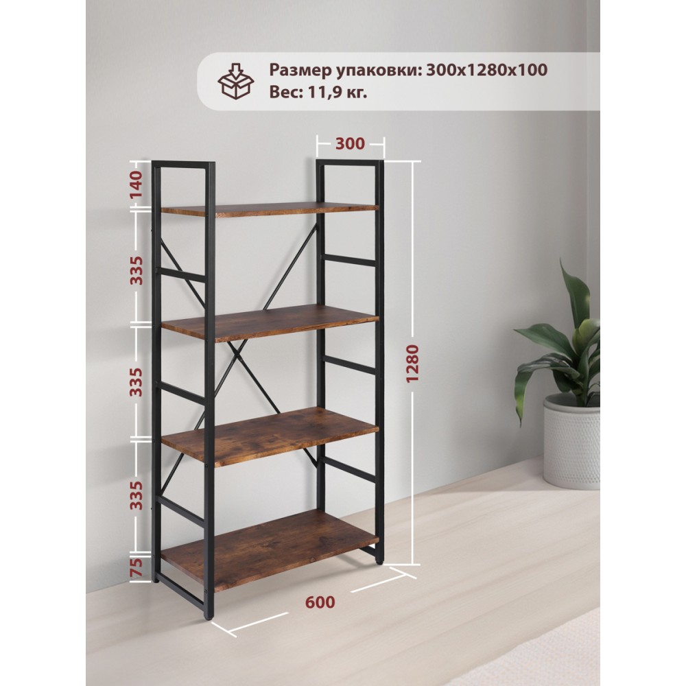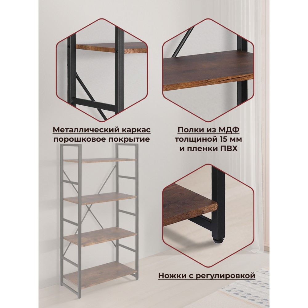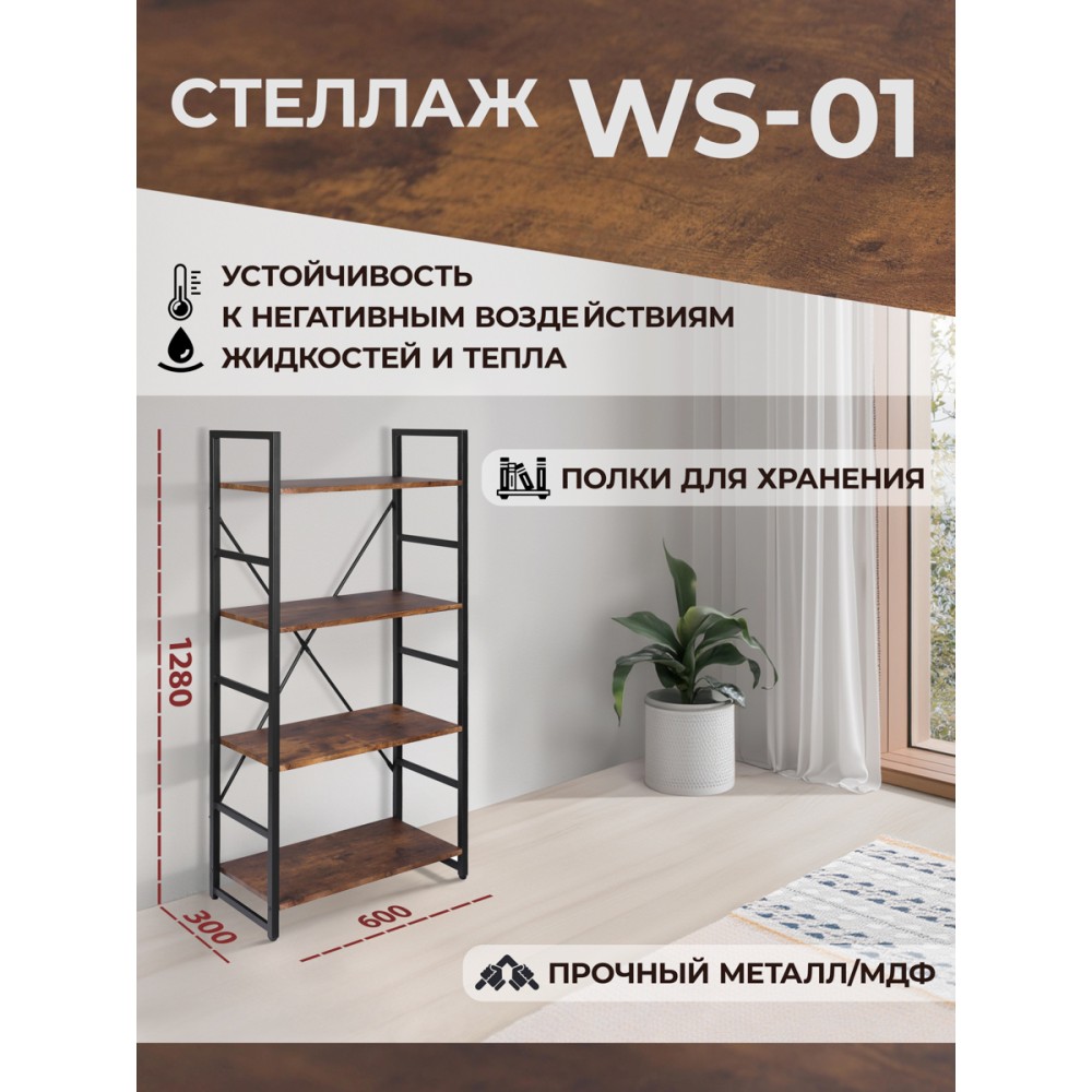 Стильный стеллаж WS-01отлично дополнит интерьер кухни, гостиной, столовой, прихожей, а также рабочего кабинета. Вместительная модель прекрасно подойдет не только для хранения вещей, но и для зонирования или декорирования пространства. Цветы, фото и аксессуары на полках подчеркнут индивидуальность своего владельца и станут отличным дополнением интерьера. Устойчивый каркас стеллажа изготовлен из металла с порошковым покрытием, выдерживает сильные нагрузки и обладает высокой прочностью. Удобные полки сделаны из МДФ толщиной 15 мм и пленки ПВХ. Такой материал экологичен, не деформируется, влагонепроницаем, устойчив к перепадам температур и ультрафиолетовым лучам. Ножки дополнительно регулируются для устранения неровности пола и для более основательного положения стеллажа. Сочетание черного металлического каркаса и коричневых полок выглядит стильно и современно. Надежность, практичность, уникальный дизайн и долговечность стеллажа будут радовать и восхищать вас на протяжении длительного времени. Стол очень прост в сборке, инструкция по сборке прилагается.