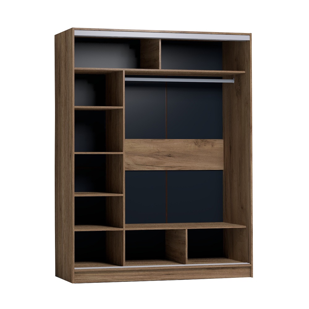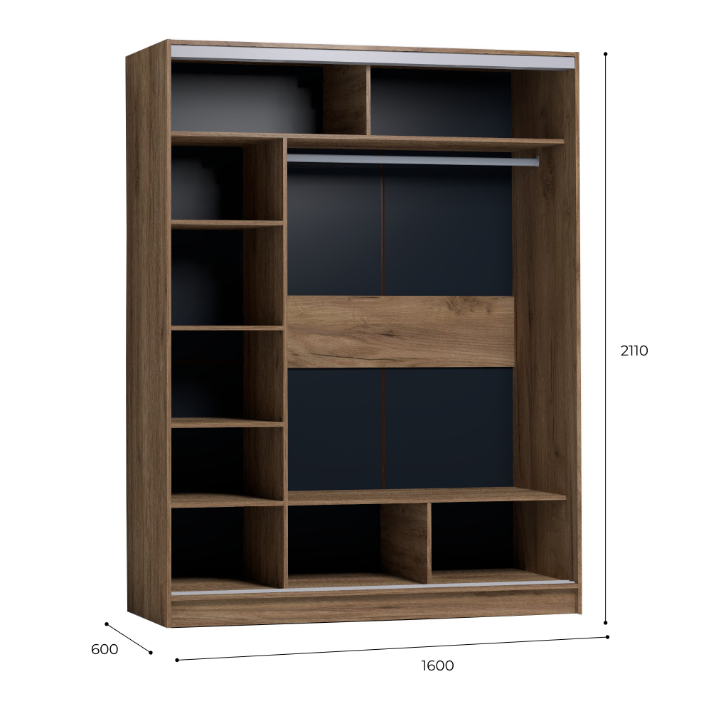 В шкафу-купе шириной 160 см найдется место для гардероба всей семьи. Разместите в нем бельё, верхнюю одежду и аксессуары. Продуманное внутреннее наполнение шкафа состоит из стеллажа для белья, четырех больших ниш внизу и вверху, а также стационарной штанги длиной больше метра. В изготовлении шкафов-купе STRIKE использована прочная стальная система треков «Найди» цвета Металлик. Двери шкафов дополнены ручками из массива и шлегелем, который смягчает удары дверей при закрывании, а также защищают вещи от попадания пыли. Благодаря скрытым полкодержателям полки жестко крепятся на необходимой высоте.