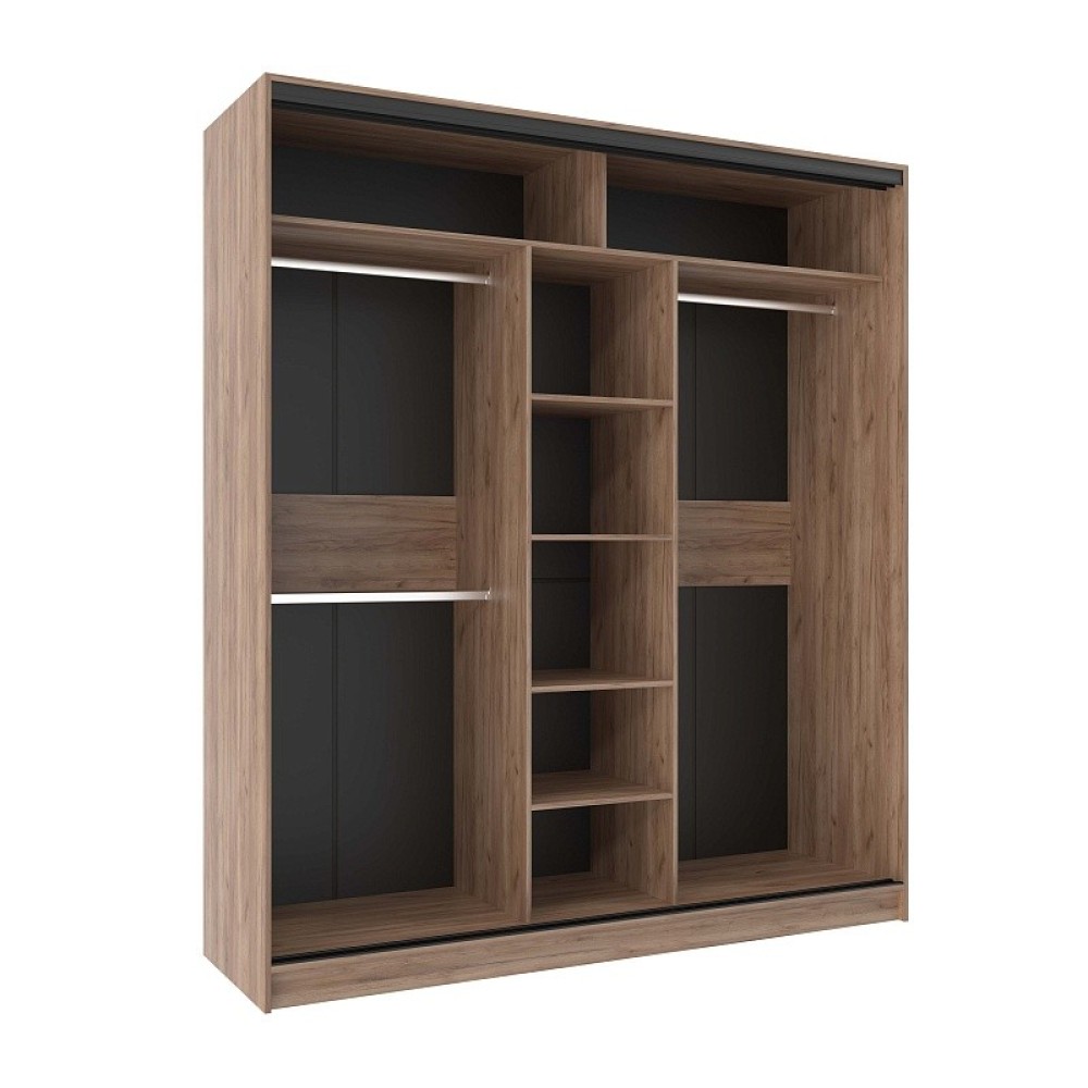 В шкафу-купе шириной 2 м найдется место для гардероба всей семьи. Разместите в нем бельё, верхнюю одежду, головные уборы и саквояж. Продуманное внутреннее наполнение, состоящее из трёх стационарных штанг и полок для белья, позволяет зонировать хранение одежды каждого члена семьи. Благодаря разделению фасада на три двери, доставать вещи очень легко. Зеркало центральной двери с обратной стороны проклеено специальной защитной пленкой, которая предотвратит от падения осколков, если оно разобьется. Если нужно взять вещи из шкафа в темное время суток и при этом не разбудить супруга,установитеКарниз 101 Домашнийс подсветкой.