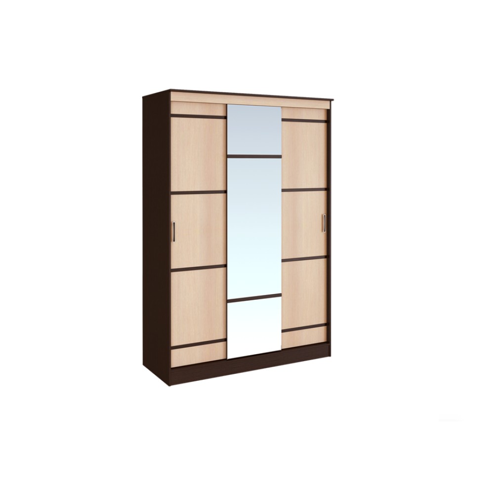 Шкаф оснащён тремя раздвижными дверцами, которые открываются плавно и бесшумно. Центральная створка выполнена полностью из зеркала, что визуально увеличивает пространство комнаты. Боковые панели декорированы тёмными полосками, которые придают шкафу изысканность и индивидуальность.