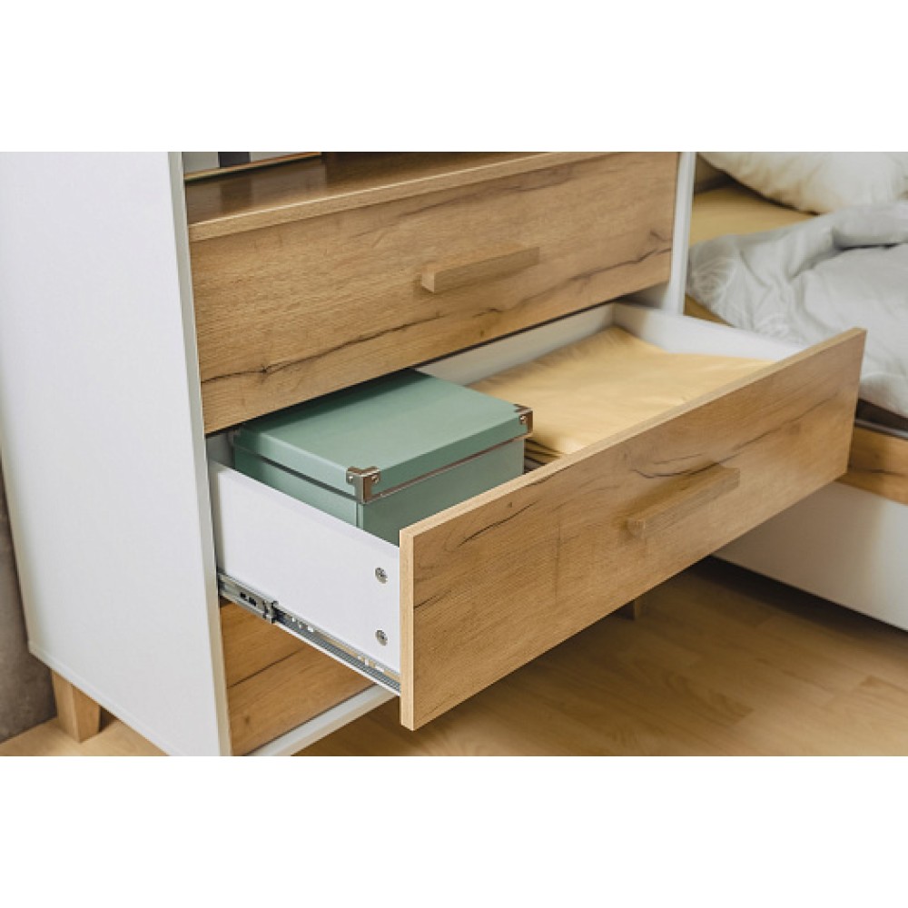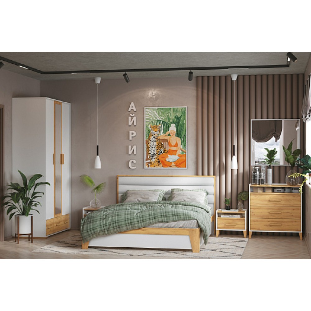 В модульной коллекции Айрис каждая деталь продумана до мелочей. Древесные фасады систем хранения как будто укутаны вбелоснежный цвет, в котором представлен корпус. Тонкие точеные опоры, деревянные ручки геометрической формы, использование зеркал на фасадах и разноплановое наполнение шкафов, долговечная фурнитура - еще не все преимущества Айрис. Мебель надежна, но совсем не массивна.Изготовлена из высококлассного ЛДСП класса эмиссии Е1, что гарантирует безопасность в процессе ежедневной эксплуатации. А кромка ПВХ по периметру изделий защитит их от деформации и продлит срок службы. Разнообразие модулей позволит Вам без труда собрать идеальный комплект и рационально организовать пространство спальни. Например, комплект 2 состоит из двуспальной кровати, двух прикроватных тумб, низкого комода с ящиками и шкафа для одежды и белья. Зеркало в комплект не входит.