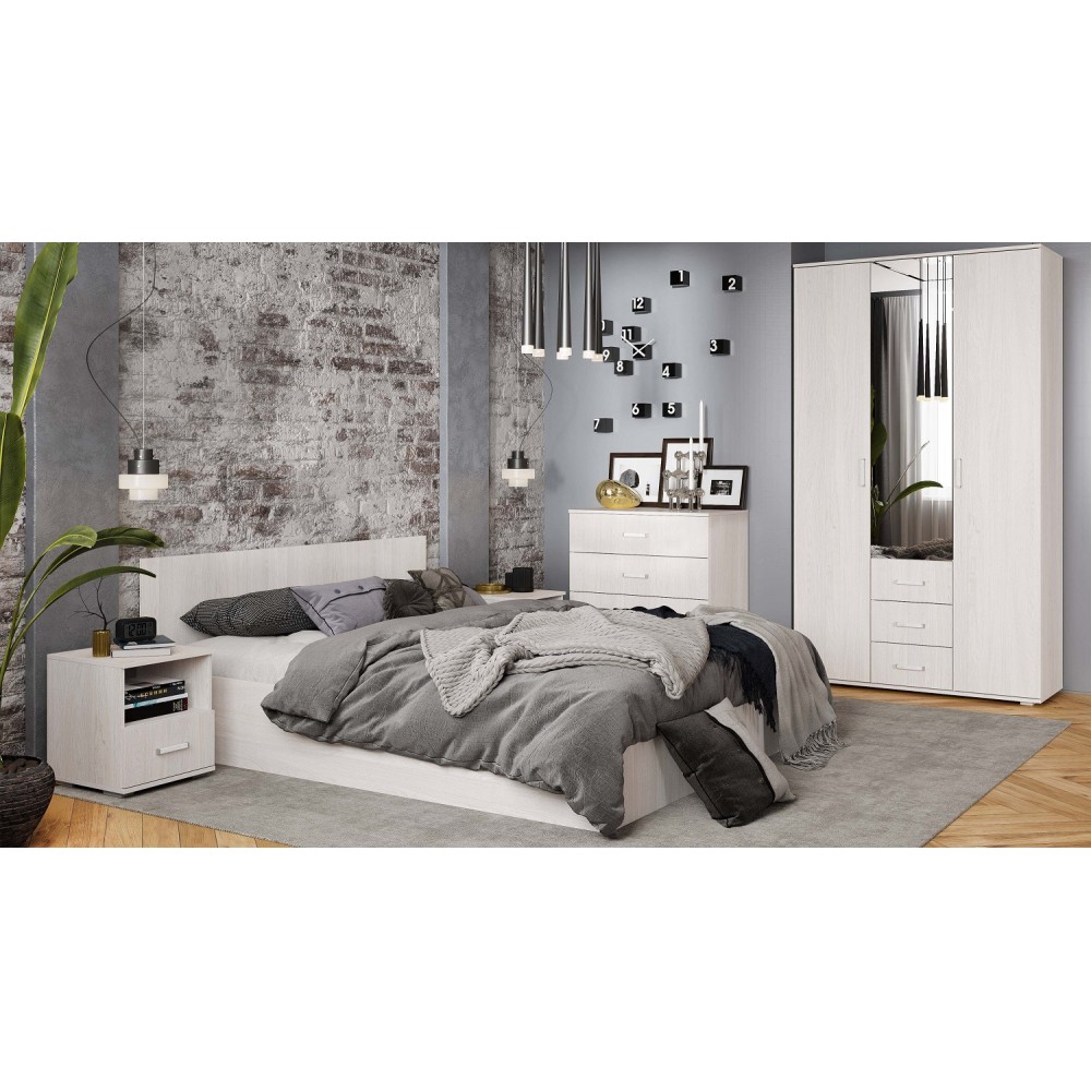 Мебель для спальни Белла – это коллекция, которая отличается простыми геометрическими формами и уникальной древесной фактурой. Благородный декор наполнит комнату свежестью и легкостью и визуально облегчит интерьер. Это особенно важно в малогабаритных квартирах, пространство которых не хочется загромождать.Комплект 1 состоит из удобной двуспальной кровати, двух прикроватных тумб, комода с ящиками и шкафа для одежды и белья.