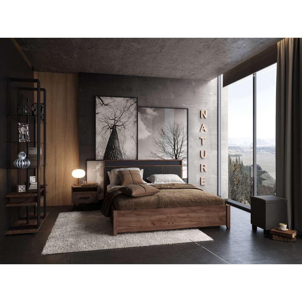 Простые прямые линии, отсутствие сглаженных углов и лишних изгибов придают спальне NATURE особую атмосферу стиля лофт.Изголовье в древесной раме, декоративная строчка золотой нитью на мягких подушечках кровати из черной экокожи – изюминка спальни NATURE. Максимально рационально использовать квадратные метры спальнипозволит подъемное основание, которое идет в комплекте с кроватью. Благодаря газлифтам, основание поднимается без усилий и обеспечивает доступ к вместительному внутреннему коробу, изолированному от пыли.