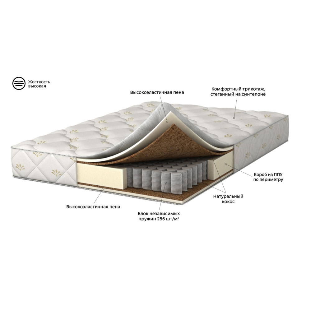 Комфортный трикотаж, стеганный на синтепоне, высокоэластичная пена, натуральное кокосовое волокно, блок независимых пружин повышенной надежности, пенополиуретан по периметру