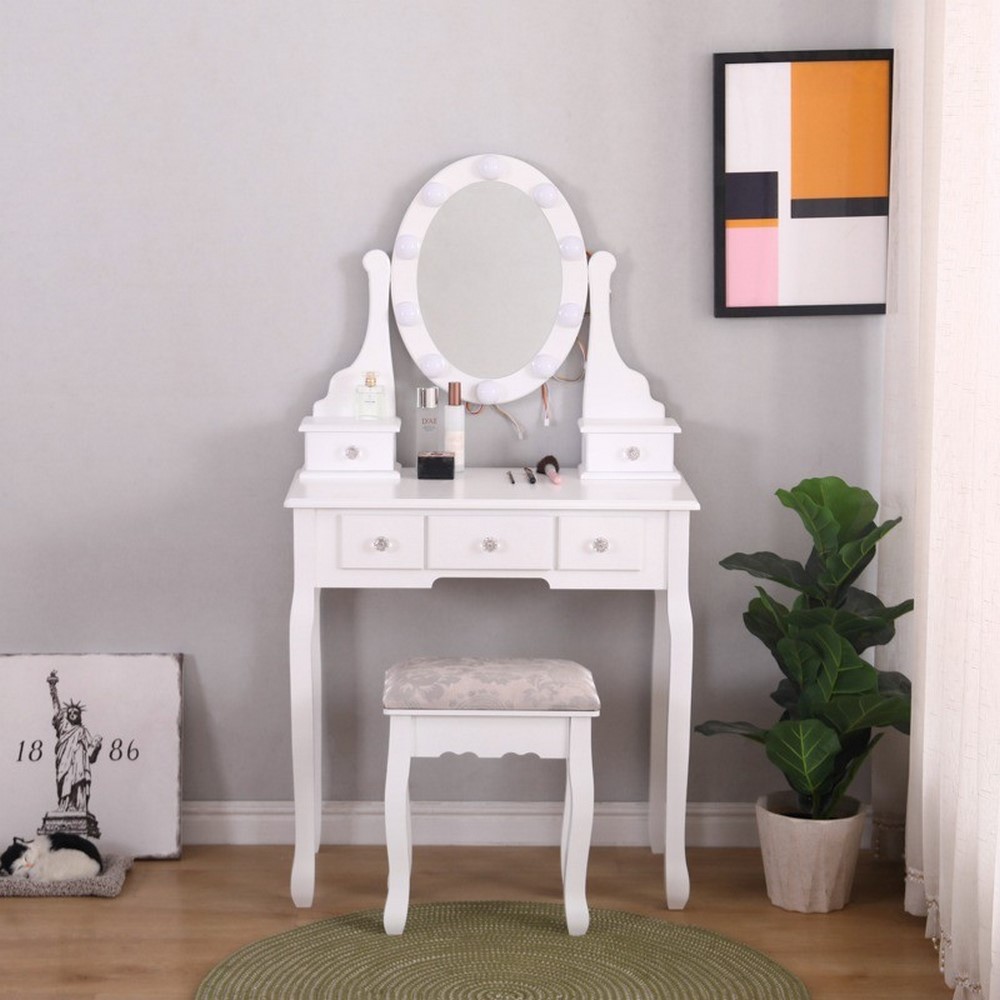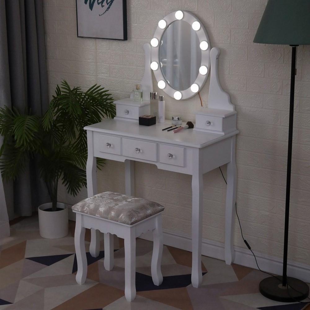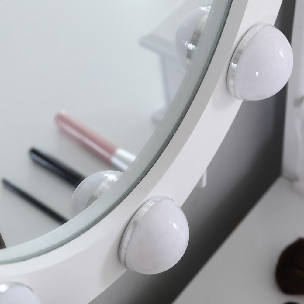 Туалетный столик S010 для спальни в классическом стиле с зеркалом с ламповой подсветкой, выдвижными ящиками и пуфом.