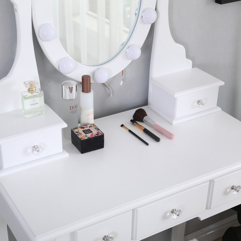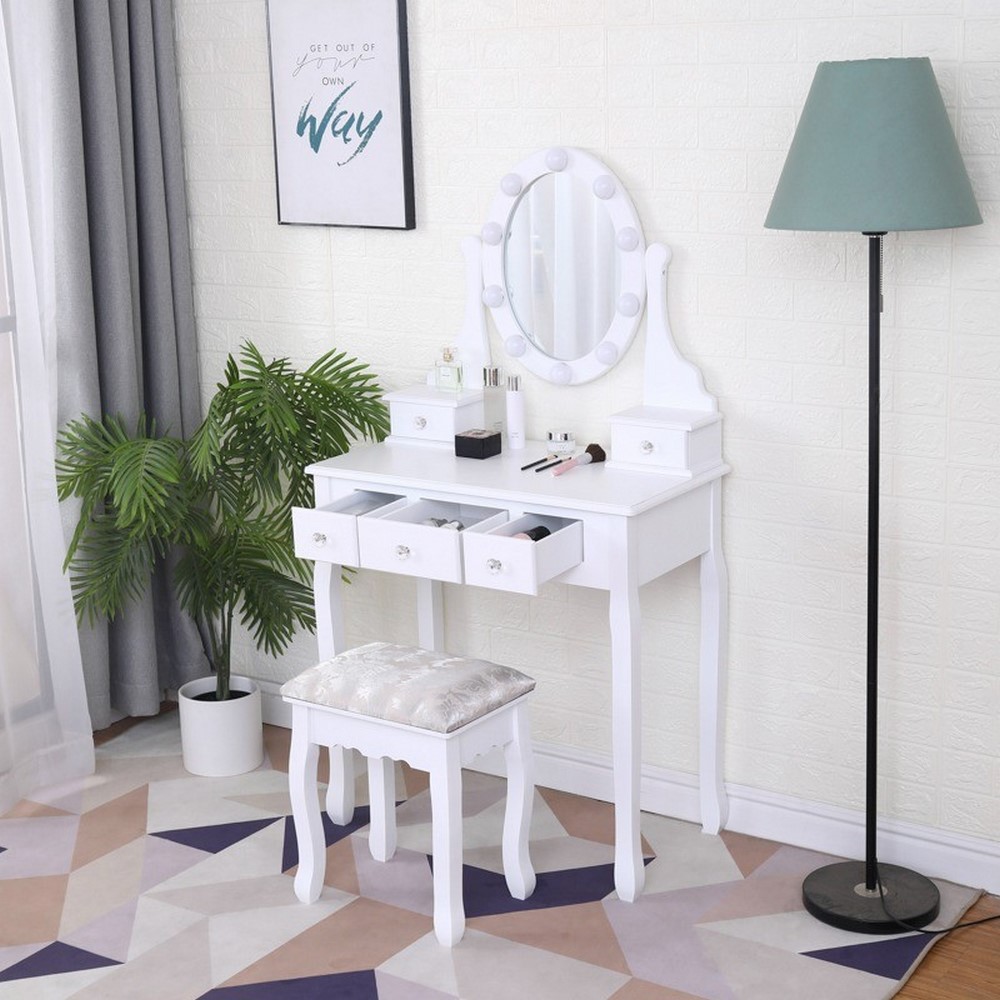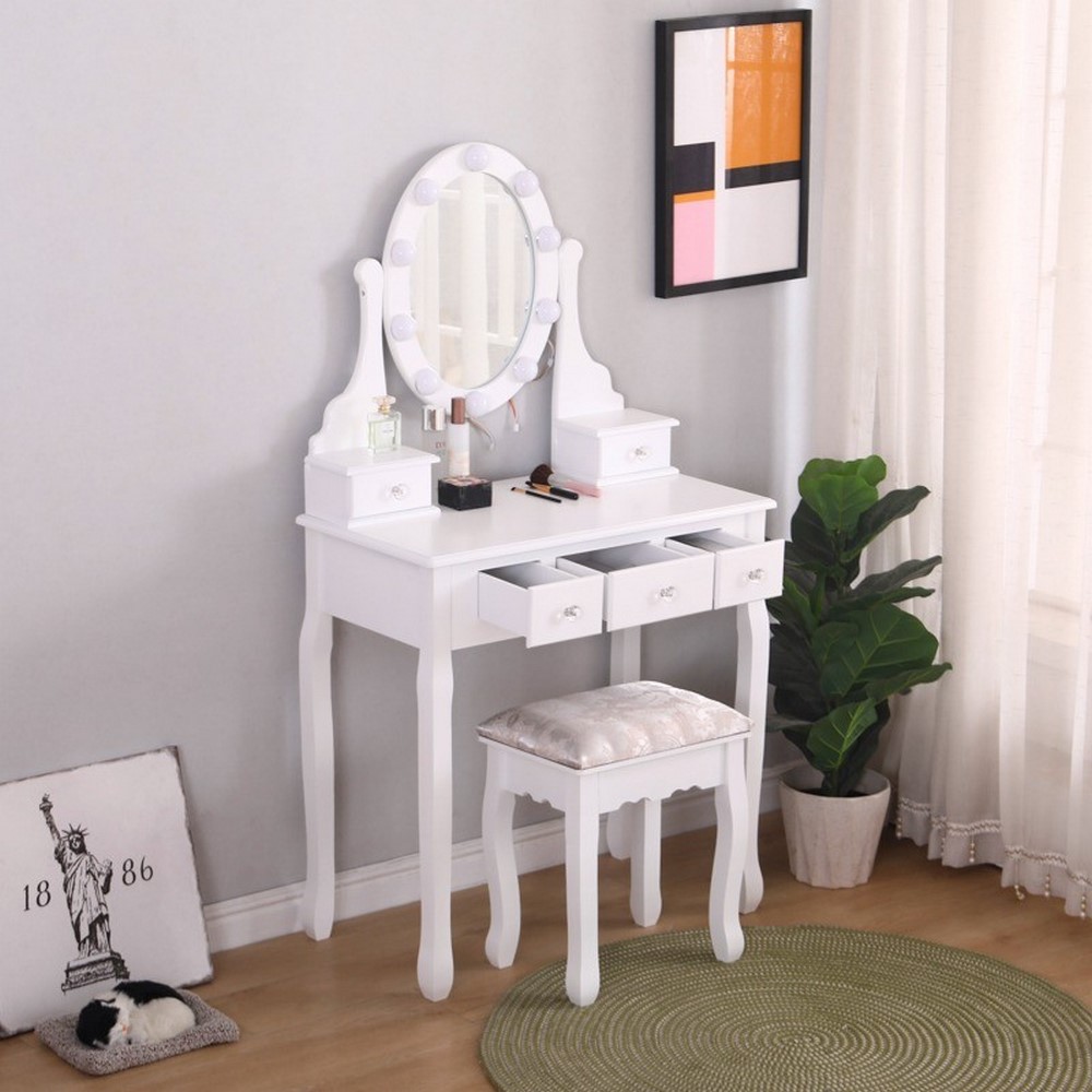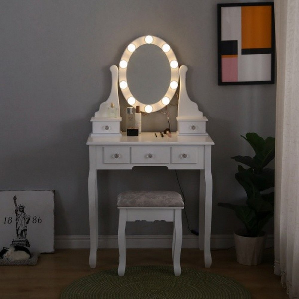 Туалетный столик S010 для спальни в классическом стиле с зеркалом с ламповой подсветкой, выдвижными ящиками и пуфом.