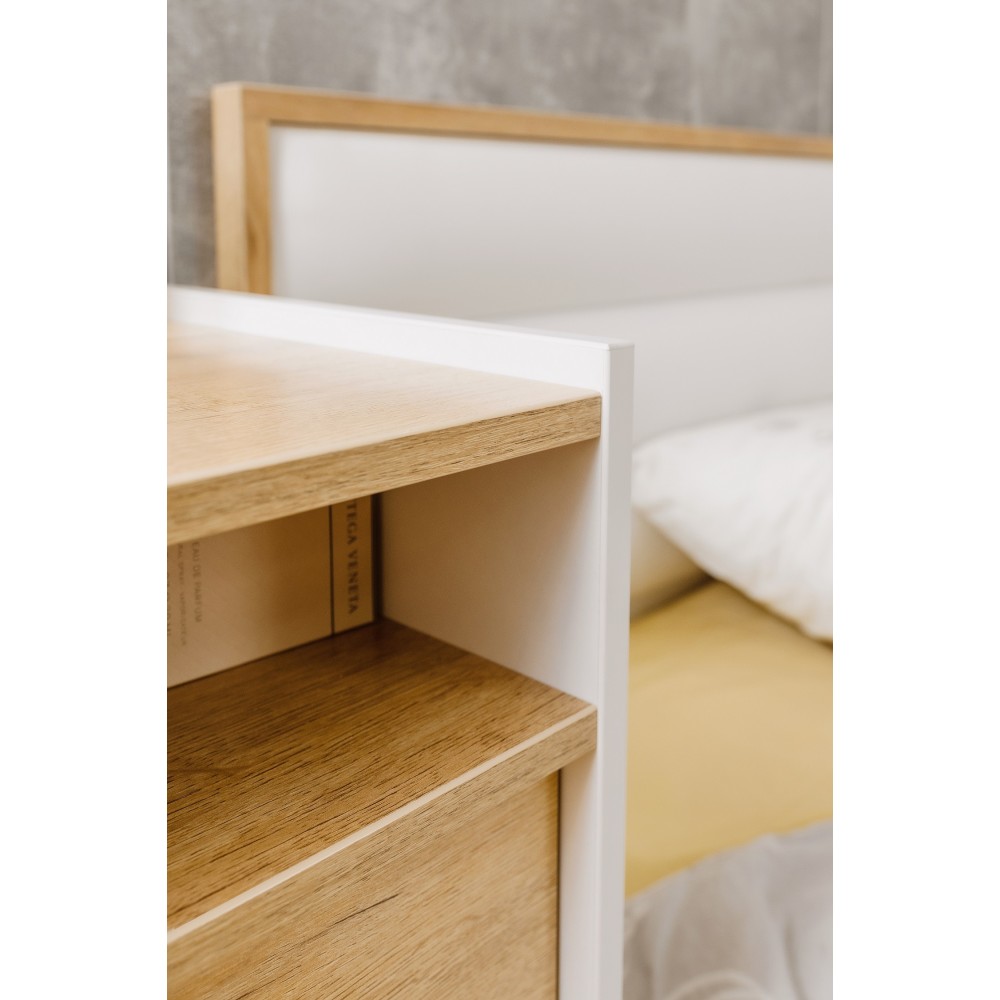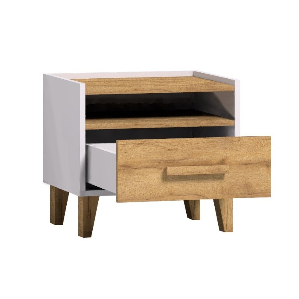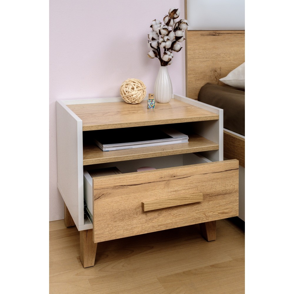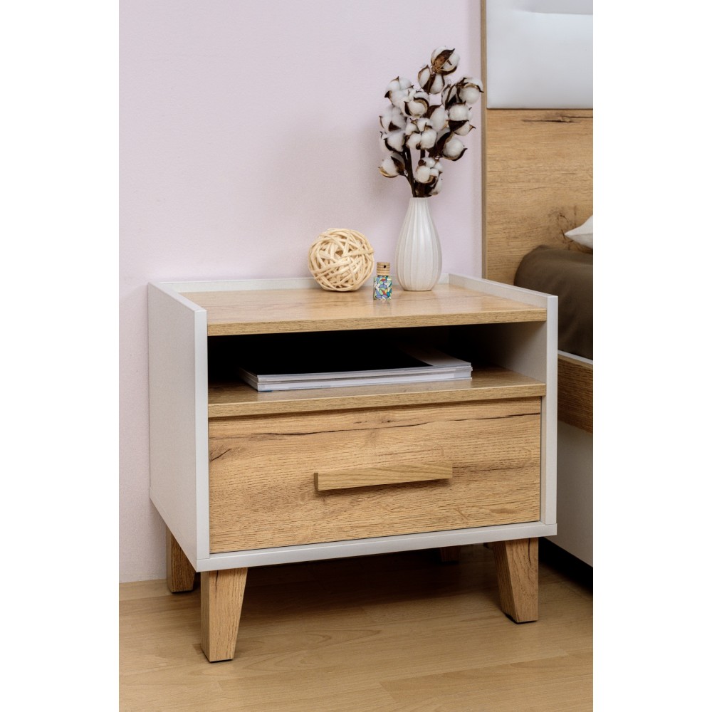 Прикроватная тумба гармонично дополняет мебельный гарнитур в спальне. В поисках тумбы в скандинавском стиле рекомендуем обратить внимание на Айрис. Модель на высоких ножках - это практичное место для хранения мелочей, которые необходимо иметь под рукой перед сном и с утра после пробуждения. Ручки из массива дерева выполнены в том же декоре, что полка, фасад ящика и ножки. Декор "дуб золотистый" имитирует текстуру натурального дерева и прекрасно сочетается с белым корпусом модуля.
