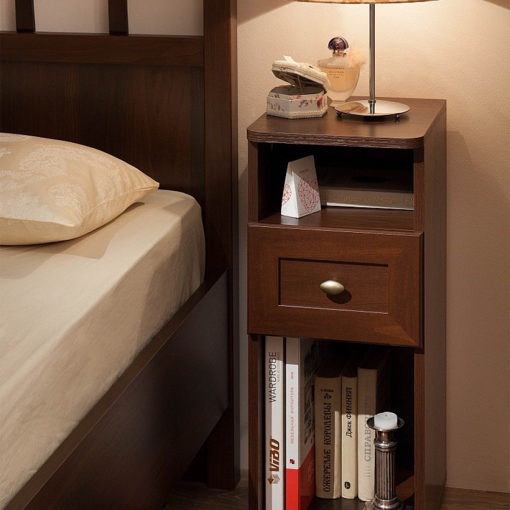 Прикроватная тумба - компактное и привлекательное дополнение к основному мебельному гарнитуру в спальне. Высокая тумбочка из коллекции Sherlock гармонично впишется в классический интерьер Вашей спальни и не займет много места. Модель оснащена столешницей со скругленными углами, куда поместится ночник, узкий выдвижной ящик на шариковых направляющих полного, плавного и бесшумного выдвижения, а также две открытые ниши. Нижняя подойдет для хранения альбомов, журналов, планшета, а верхняя - для различных мелочей, которые необходимо иметь под рукой перед сном и после пробуждения.