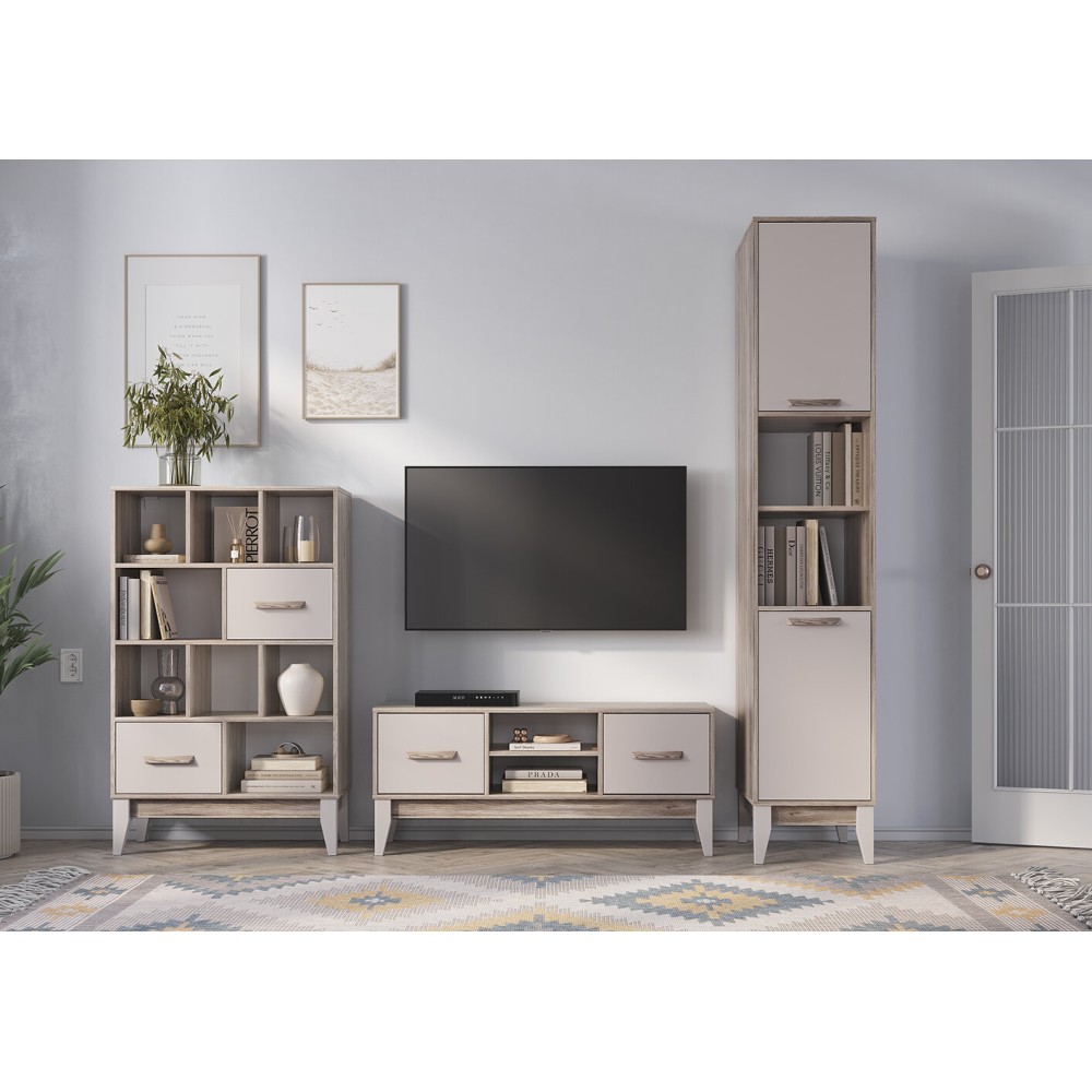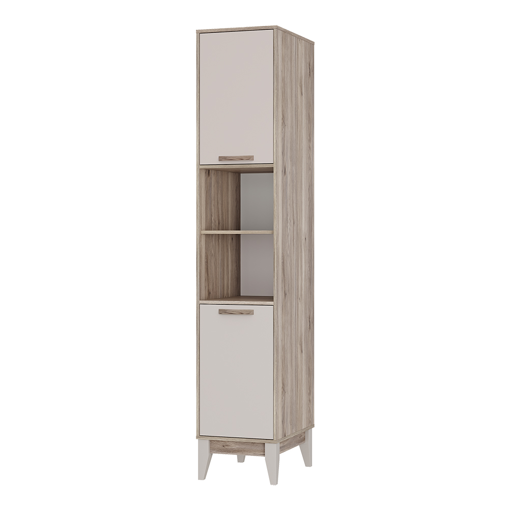 Пенал из модульной серии Скандика состоит из четырех полок, скрытых за дверцами и двух открытых полок, на которых можно разместить книги, документы, предметы декора, игрушки и одежду. Ручки повторяют текстуру корпуса «дуб смоки», а створки плотно фиксируются на магнитах.