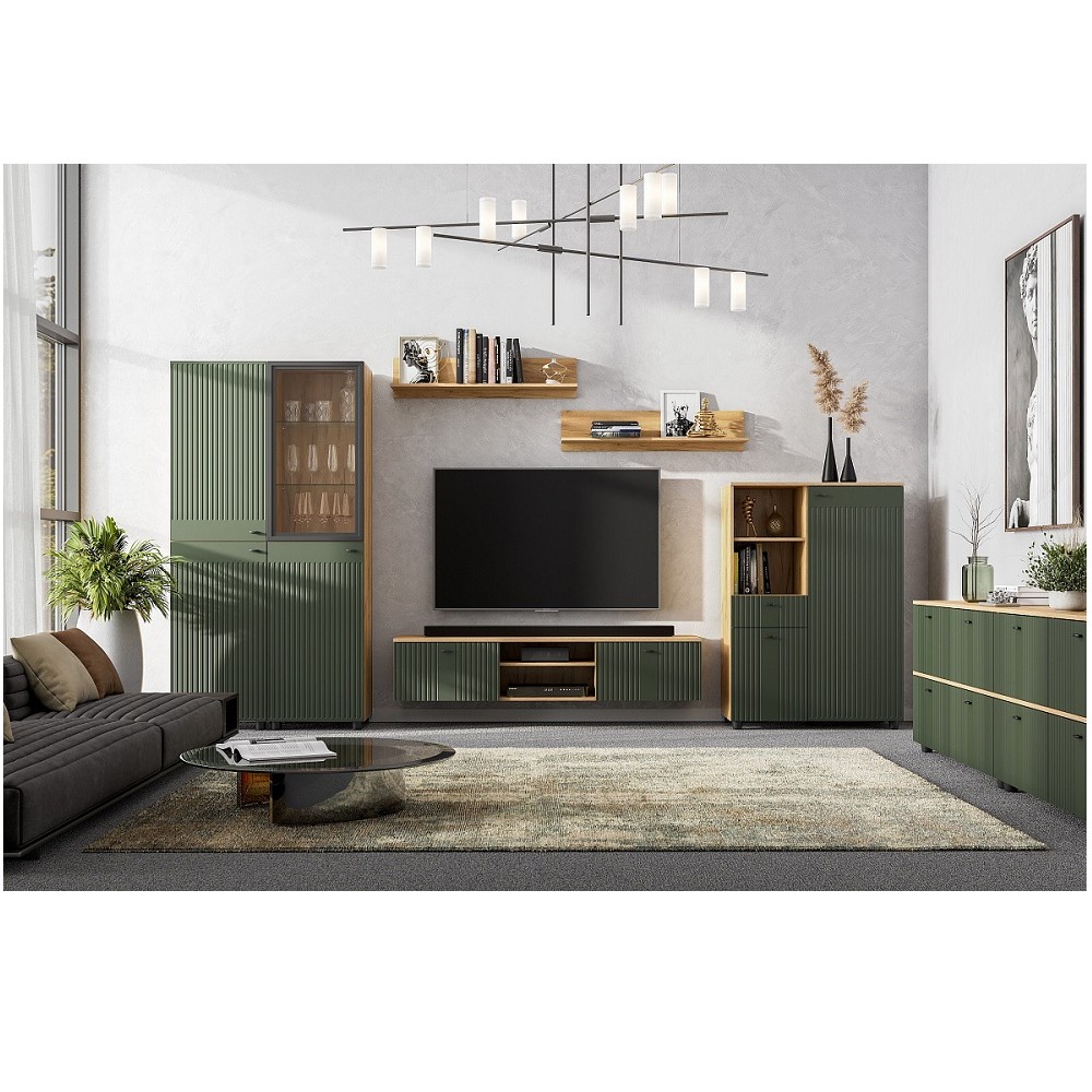 Модульная Система "Милан" Пенал со стеклом Дуб Золотой/Черный/Олива Софт