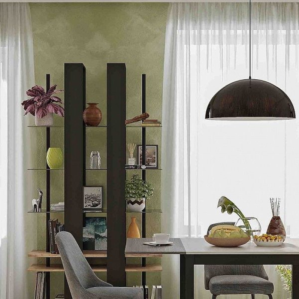 Изящный и стильный стеллаж с открытыми полками не займёт много свободного места, но станет значимой интерьерной деталью гостиной. Комбинация стеклянных полок и элементов «под дерево» выглядит стильно и очень достойно. Благодаря невидимым глазу креплениям создается впечатление, что стеклянные полки зависли в воздухе. Но несмотря на кажущуюся легкость и воздушность, тонированное стекло (бронза) выдерживает нагрузку до 5 кг, что позволит разместить на стеллаже любимые книги, диски, комнатные растения или предметы декора. Регулируемые опоры слегка приподнимут стеллаж над полом, облегчая уборку, а также позволят компенсировать незначительные неровности пола.