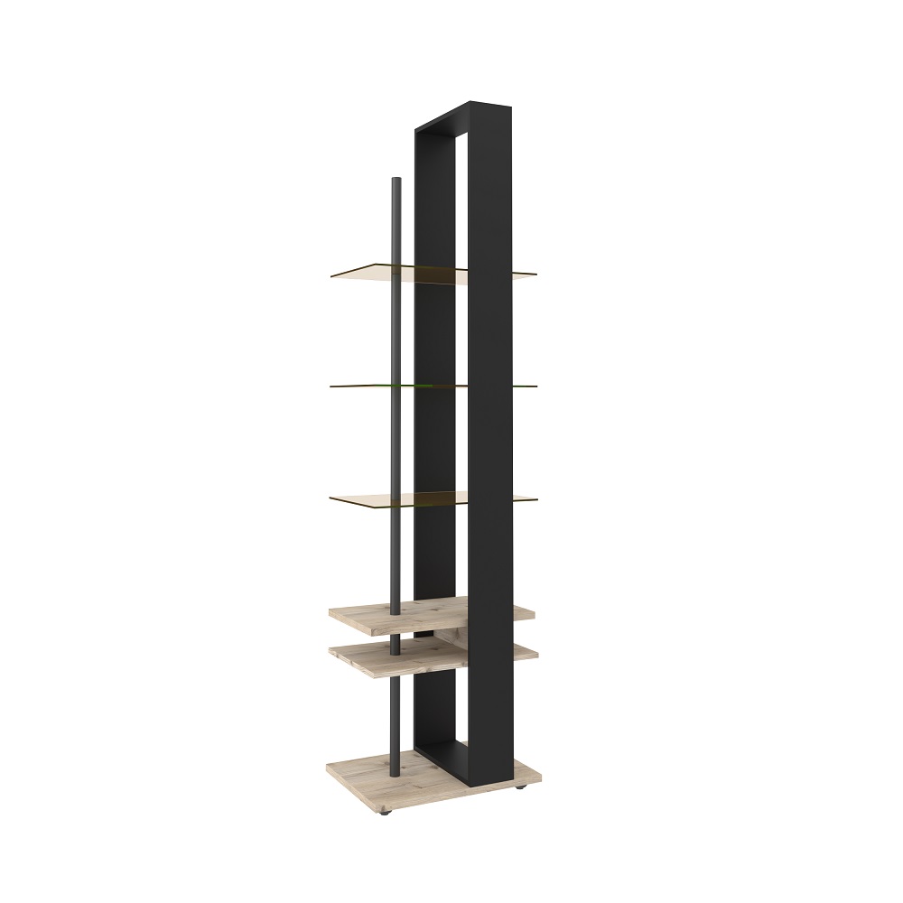 Изящный и стильный стеллаж с открытыми полками не займёт много свободного места, но станет значимой интерьерной деталью гостиной. Комбинация стеклянных полок и элементов «под дерево» выглядит стильно и очень достойно. Благодаря невидимым глазу креплениям создается впечатление, что стеклянные полки зависли в воздухе. Но несмотря на кажущуюся легкость и воздушность, тонированное стекло (бронза) выдерживает нагрузку до 5 кг, что позволит разместить на стеллаже любимые книги, диски, комнатные растения или предметы декора. Регулируемые опоры слегка приподнимут стеллаж над полом, облегчая уборку, а также позволят компенсировать незначительные неровности пола.