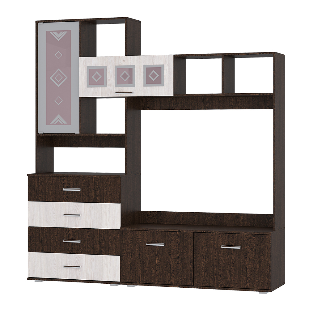 Центральная секция Белла — это стильный и функциональный элемент мебели, который добавит изысканности и уюта в ваш интерьер. Она состоит из комода с четырьмя выдвижными ящиками, тумбы под телевизор и множества полок для хранения книг, посуды и других предметов. Секция выполнена в приятном древесном декоре «ясень белый», оснащена витражными стеклянными вставками и стильной фурнитурой.