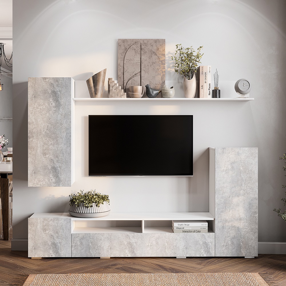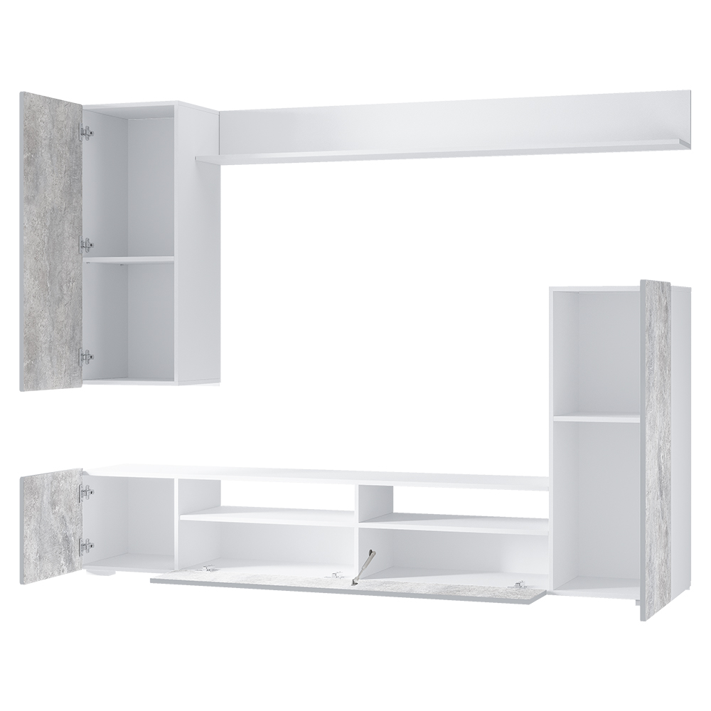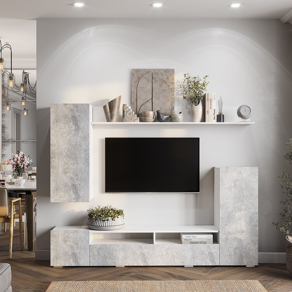 Гостиная Диаманд – отличное решение для современного интерьера. Эффектный дизайн: белый корпус и фасады цвета цемент, отсутствие лицевой фурнитуры, - сделают вашу гостиную стильной. Створки открываются путем захвата фасада сверху или снизу. Декоративная панель с открытыми полками позволит Вам расположить телевизор и другую технику, а также расставить предметы декора.