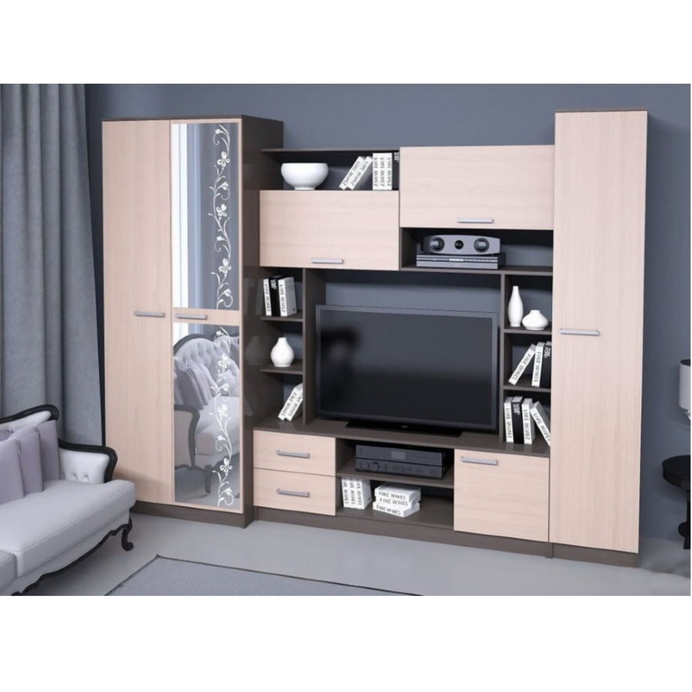 Стенка «Флора» Венге укомплектована двухстворчатым шкафом для одежды (штанга хром), пеналом с полками для белья, антресолями, ящиками и нишей под TV, которая обладает размерами 1000х800х432. Небольшим декором гостиной выступает пескоструйная обработка зеркала со стразами Swarowsky. Рисунок обладает влагоустойчивостью и даже после десяти лет не потускнеет.