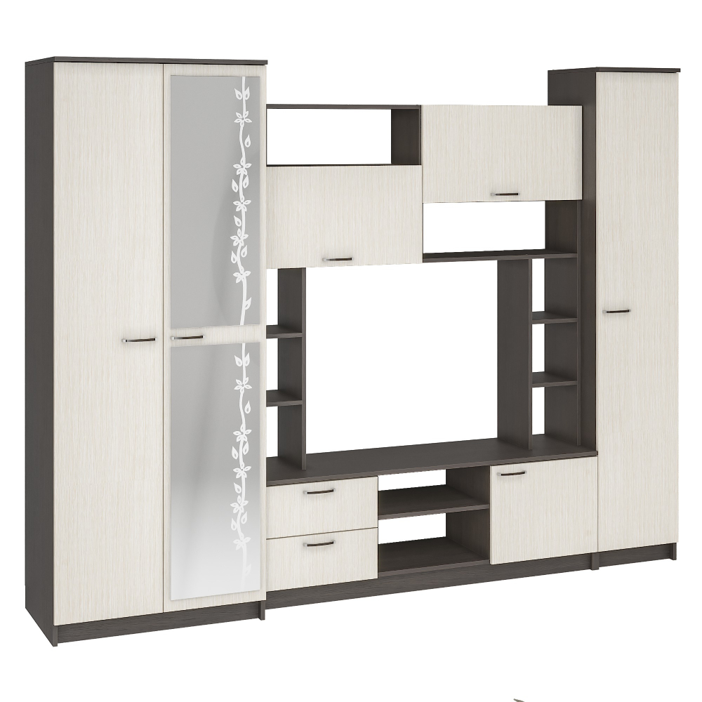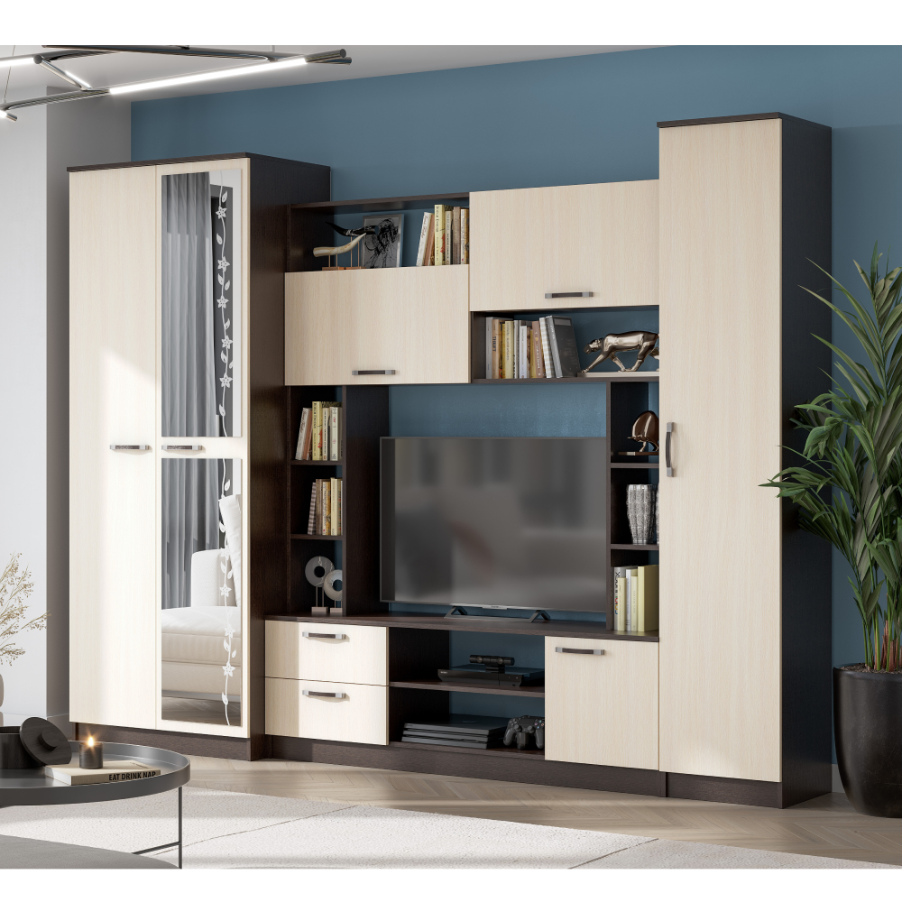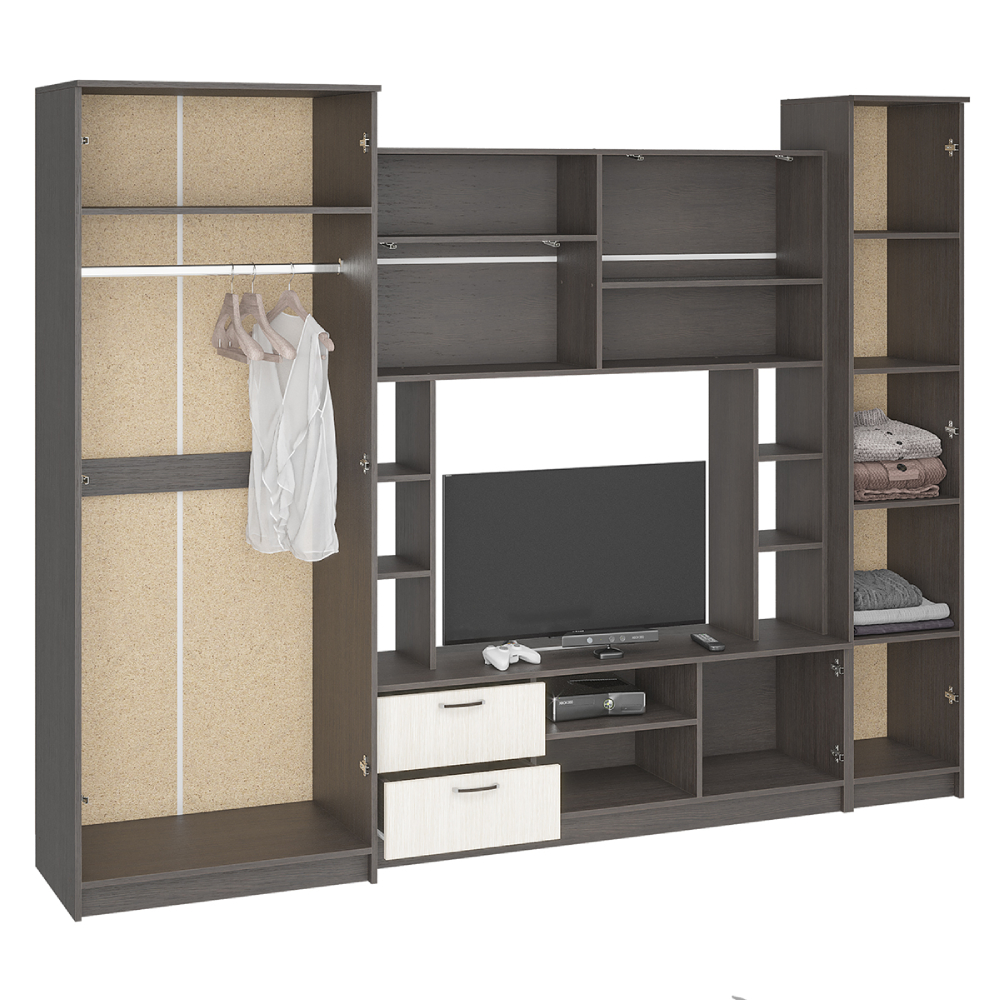 Практичная гостиная для современных интерьеров. Это готовое решение с универсальной сборкой, которое состоит из трех модулей: платяного шкафа (комплектуется горизонтальной штангой), бельевого шкафа и центральной секции с ТВ-зоной. При желании модули можно разместить отдельно друг от друга.