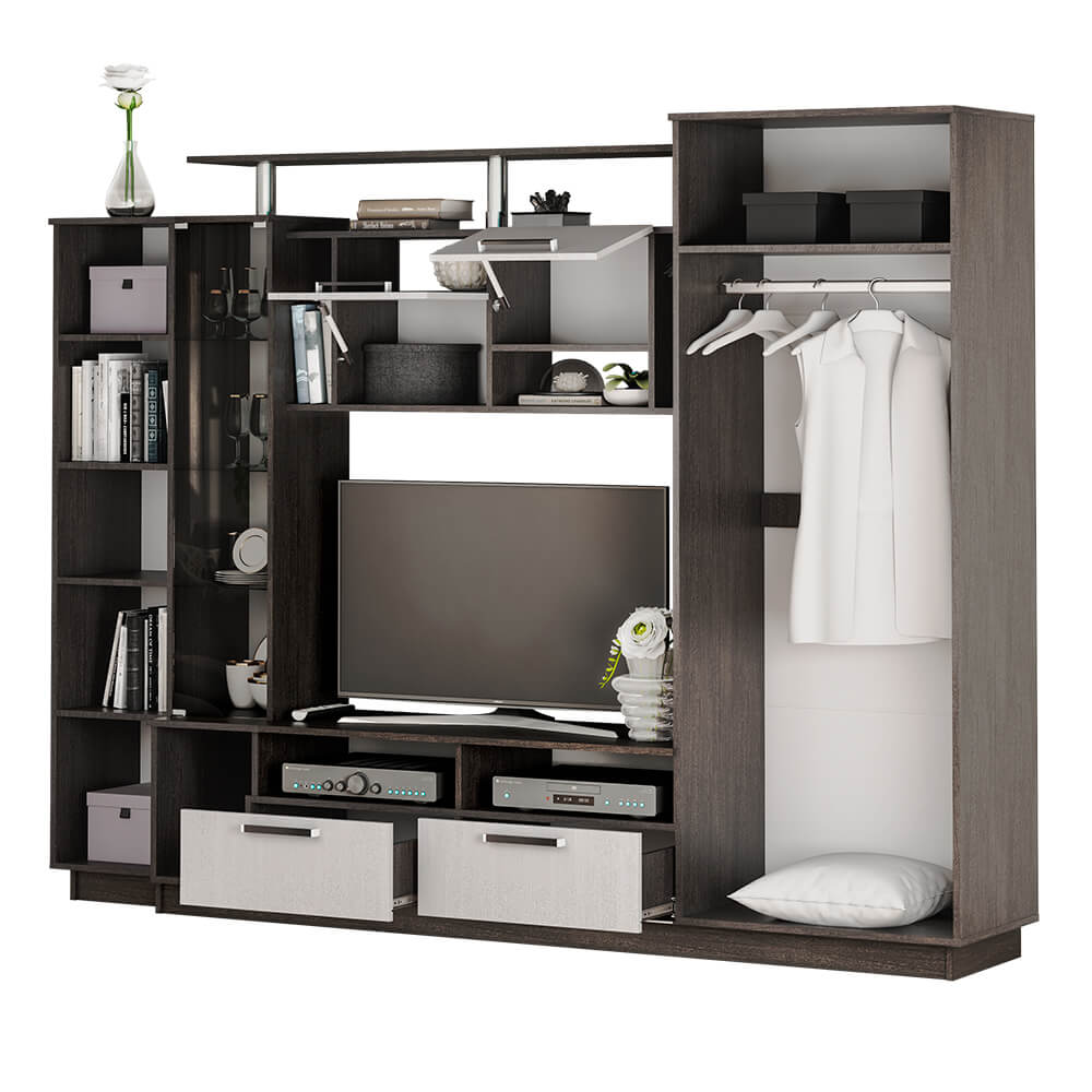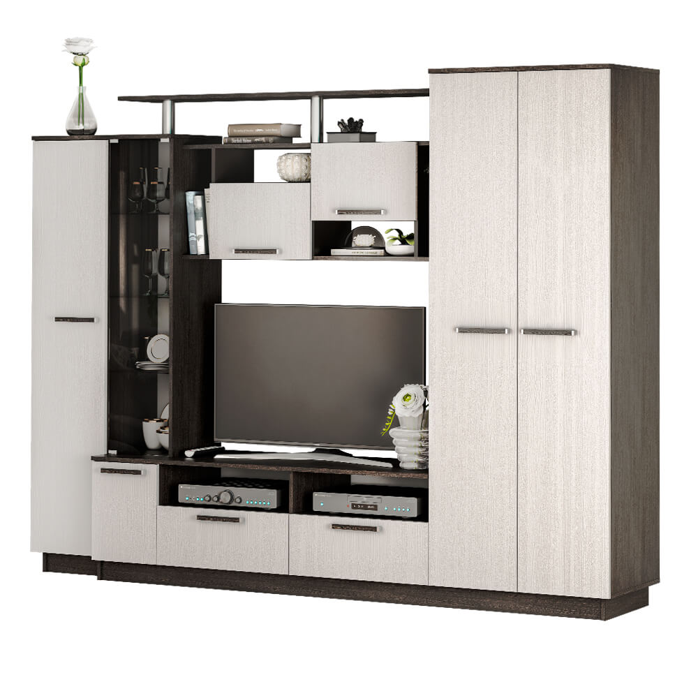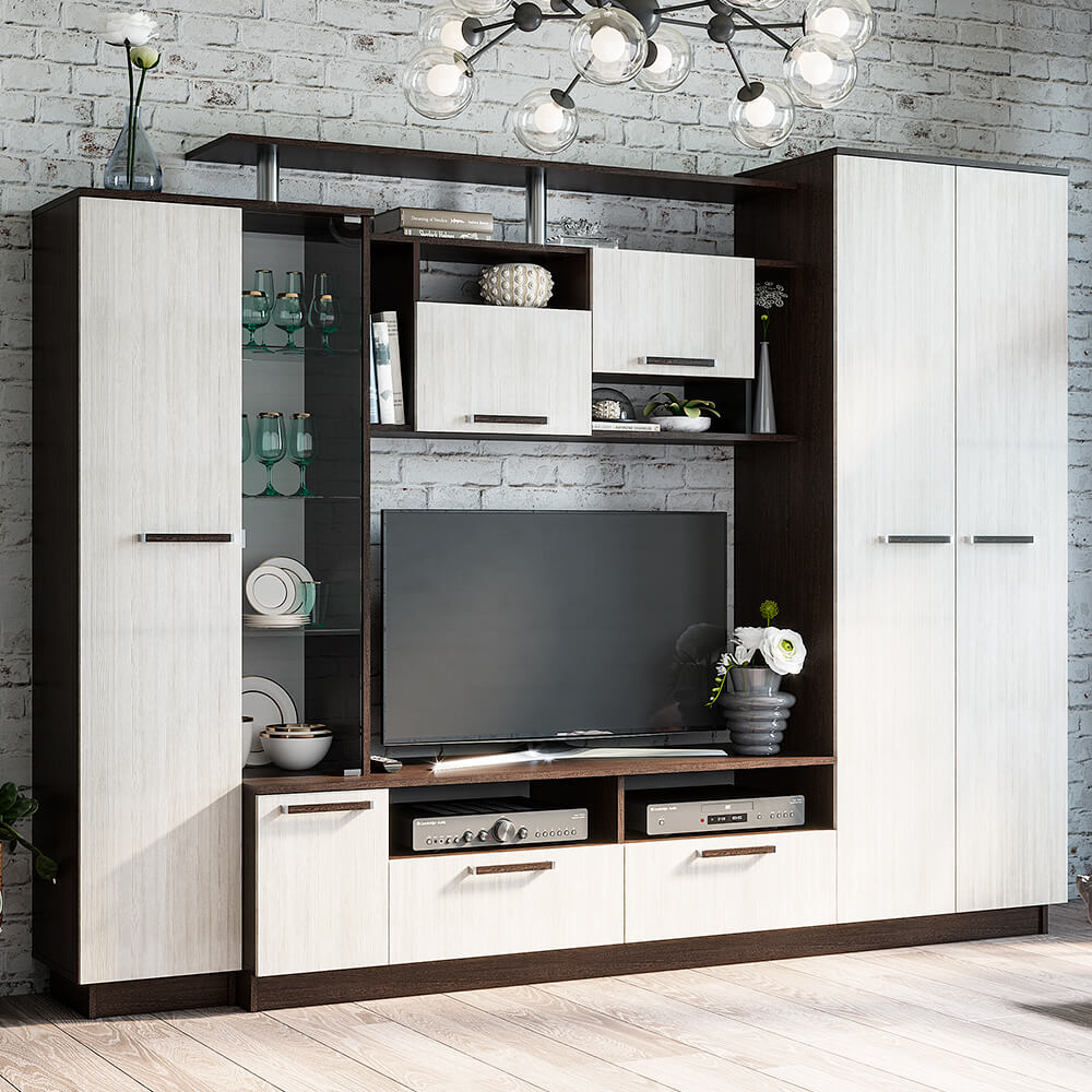 Гостиная Вега может стать главным украшением любого современного интерьера, подчеркнув естественность и ненавязчивость оформления благодаря цветовым сочетаниям. Важнейшей особенностью гостиной «Вега» является высокая функциональность. Особую грациозность модели придает стеклянный фасад гостиной, внутри которого 3 стеклянные полки.
