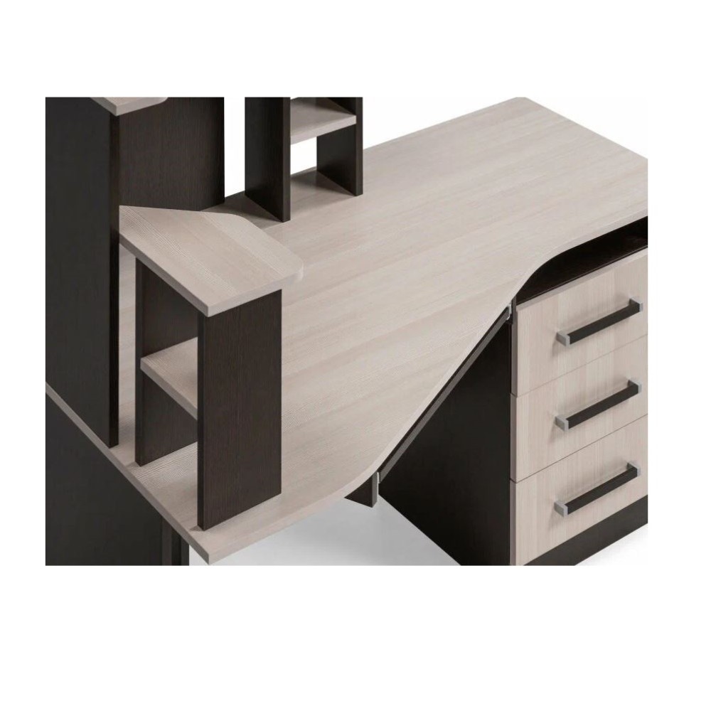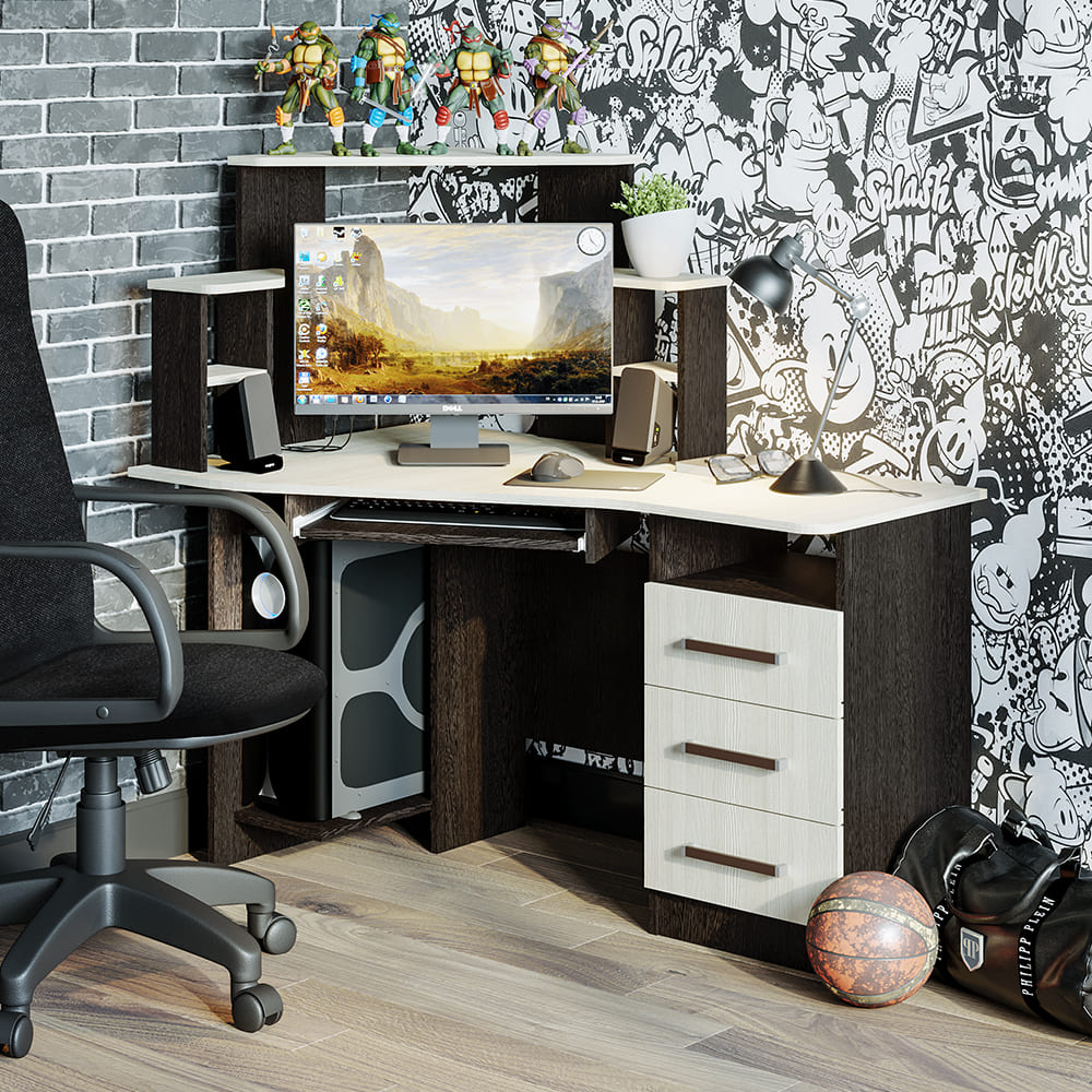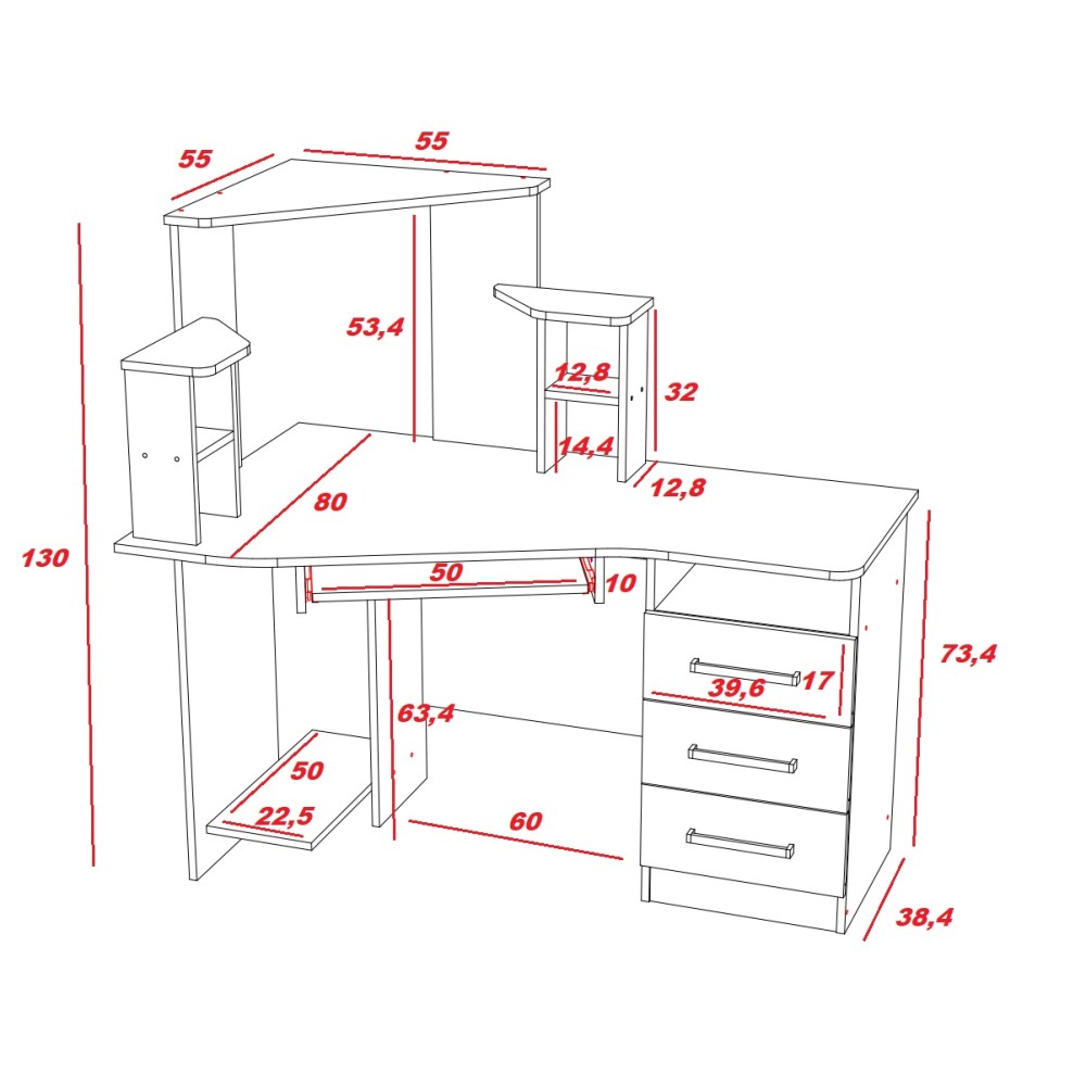 Удобный угловой компьютерный стол впишется в любой интерьер квартиры и офиса. Модель оснащена тремя выдвижными ящиками на роликовых направляющих и удобными открытыми полками для хранения различных мелочей. Также имеется полка под принтер и место под системный блок.А самое главное, что Каспер можно использовать в качестве письменного стола, ведь ширина его столешницы - 130 см.