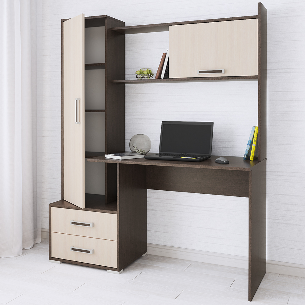 Компьютерный стол Квартет-9 - модуль, продуманный до мелочей и созданный для Вашего максимального комфорта в процессе работы или учебы дома. Прямоугольная столешница с плавными углами, надстройка с открытой и закрытой полками, закрытый шкаф-пенал и тумба с двумя выкатными ящиками - все, чтобы обеспечить удобное и грамотное хранение на рабочем месте. Приятный декор с имитацией текстуры натурального дерева придется по душе любителям эко-стиля в интерьере.
