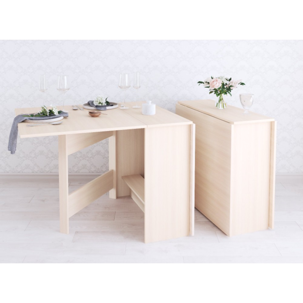 Раскладной стол для кухни - не прихоть, а скорей необходимость в малогабаритках и квартирах-студиях, где каждый метр важно использовать рационально. Данная модель имеет 3 положения: полностью сложенный, разложенный наполовину и полностью разложенный. Модель установлена на пластиковые подпятники, предохраняющие напольные покрытия от повреждения, а значит Вам не нужно бояться поцарапать пол.