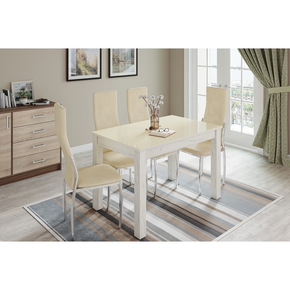 Обеденный стол Норман по достоинству оценят любители качественной и привлекательной мебели. Столешница изготовлена из ЛДСП и покрыта стеклом в декоре "лакобель ваниль". Имеет скругленные углы, что не только визуально привлекательно, но и безопасно для ежедневного использования. Опоры из МДФ облицованы высококлассной финиш-пленкой цвета "дуб крафт белый". Цвет стола визуально освежит интерьер Вашей кухни и будет гармонировать с мебельным гарнитуром.