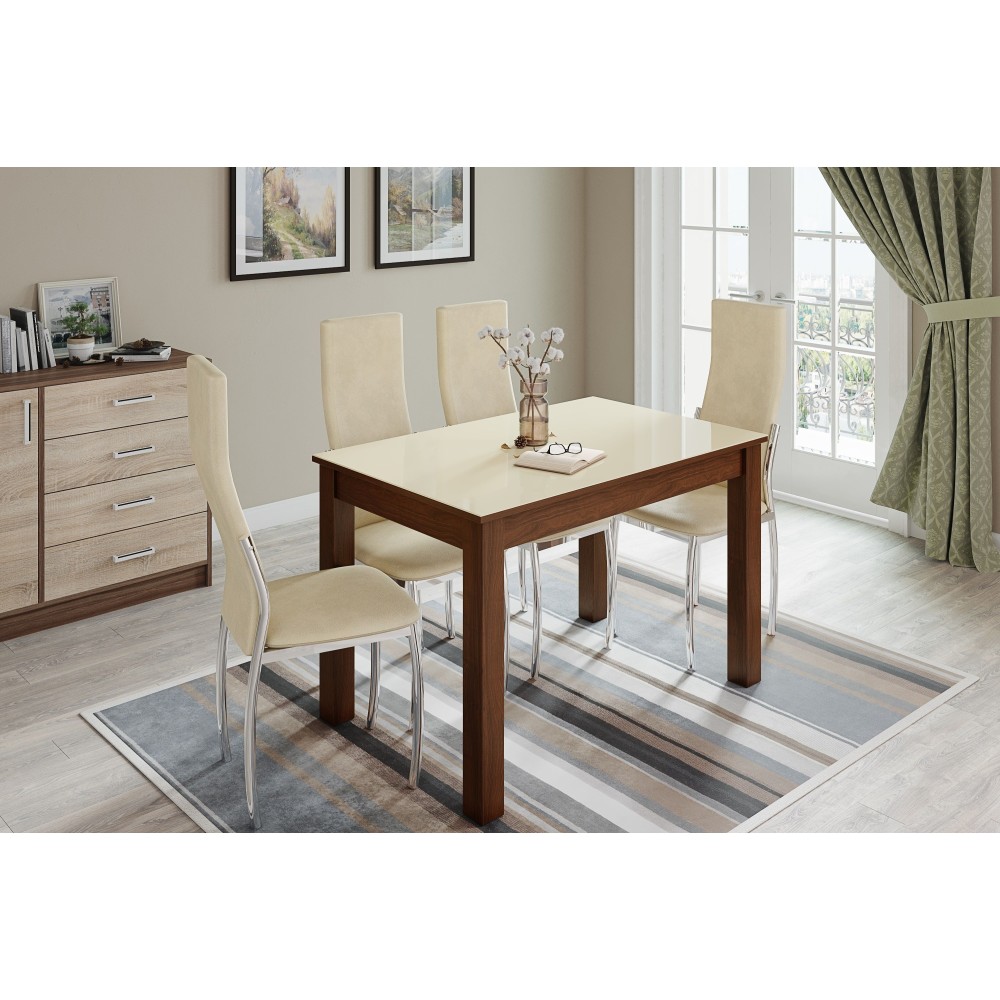 Обеденный стол Норман по достоинству оценят любители качественной и привлекательной мебели. Столешница изготовлена из ЛДСП и покрыта стеклом в декоре "лакобель ваниль". Имеет скругленные углы, что не только визуально привлекательно, но и безопасно для ежедневного использования. Опоры из МДФ облицованы высококлассной финиш-пленкой цвета "орех шоколадный". Сочетание светлой столешницы и темных ногвыглядит контрастно, но стильно.