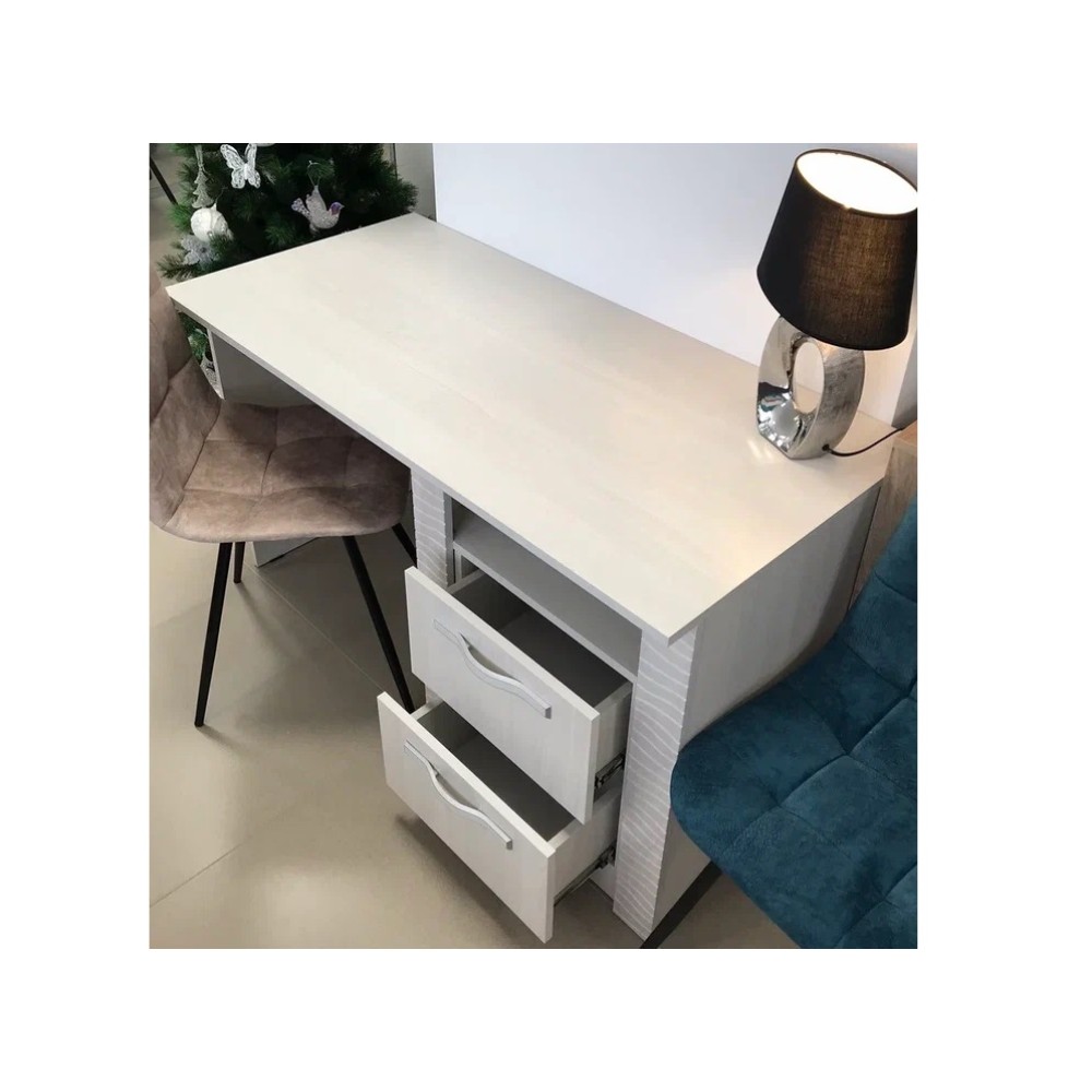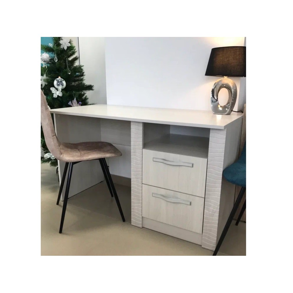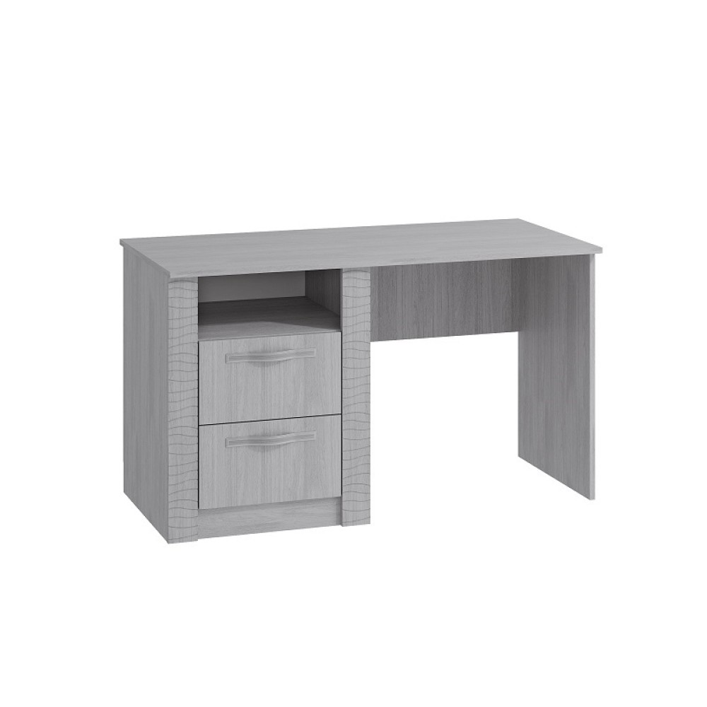 Хотите купить не только удобный, но и стильный письменный стол? Модуль из коллекции Монако - то, что Вам нужно! Оснащен двумя плавно открывающимися ящиками, небольшой открытой нишей и просторной столешницей. Вставки из МДФ на фасаде стола и эксклюзивные хромированные ручки выглядят оригинально на фоне светлого серого декора, имитирующего текстуру дерева. Вы можете использовать модель в качестве туалетного стола в спальне с мебелью Монако.