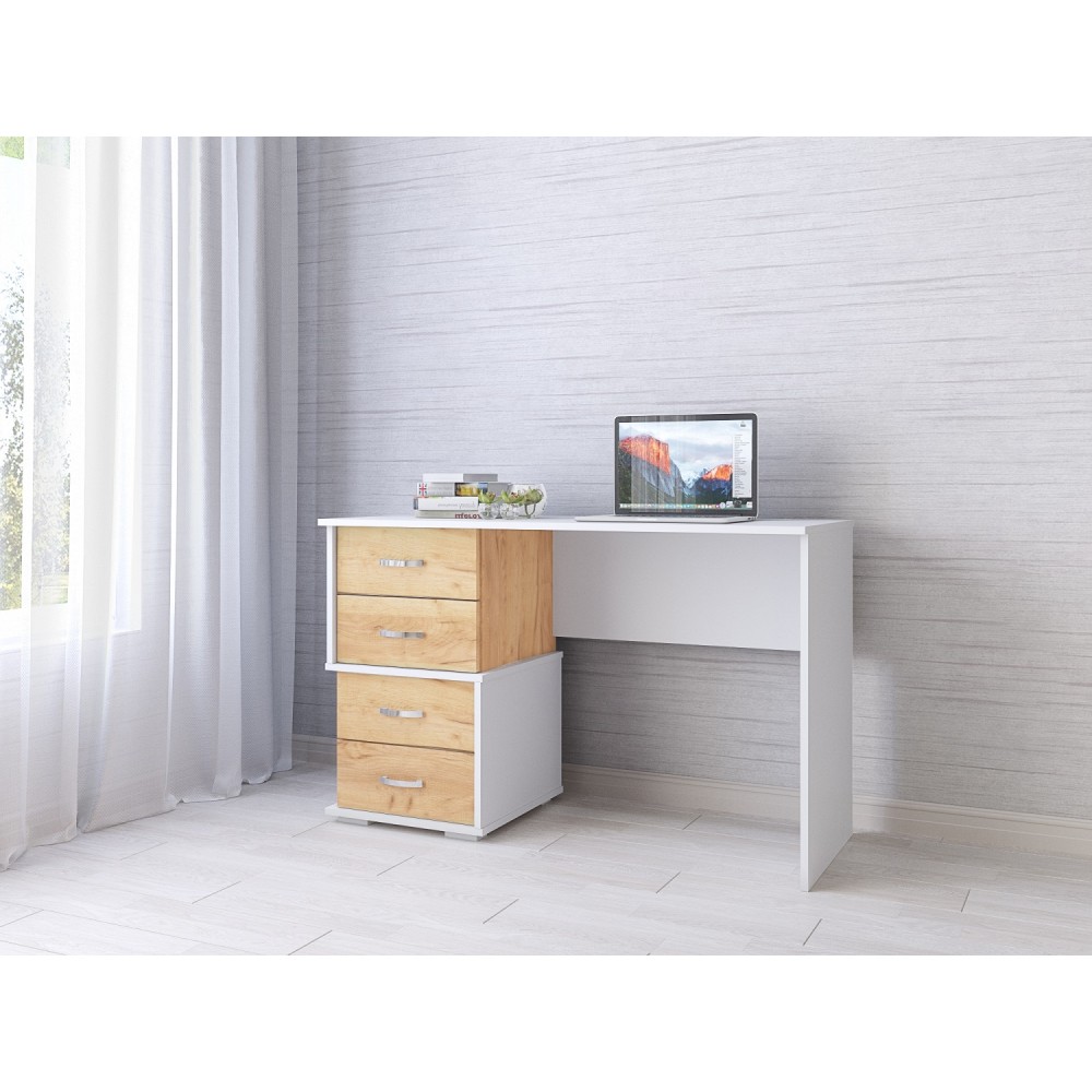 Ищете недорогой письменный стол необычной формы? Обратите внимание на модель Сити-2. Несмотря на популярный декор дуб крафт золотой/белый, стол отличается от аналогов конструкцией встроенной тумбы с ящиками. Вы сможете организовать не только функциональное и комфортное для ежедневной работы, но и визуально привлекательное рабочее место. Четыре выдвижных ящика оснащены роликовыми направляющими. Ручки пластиковые цвета "металлик".